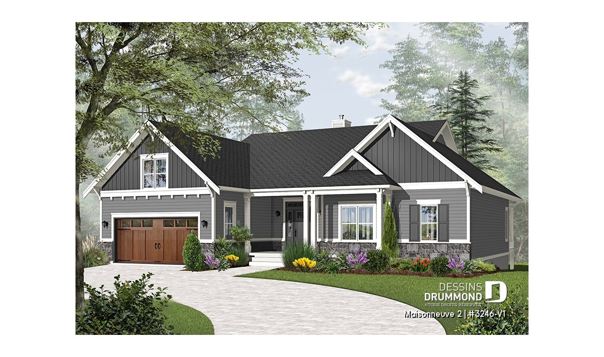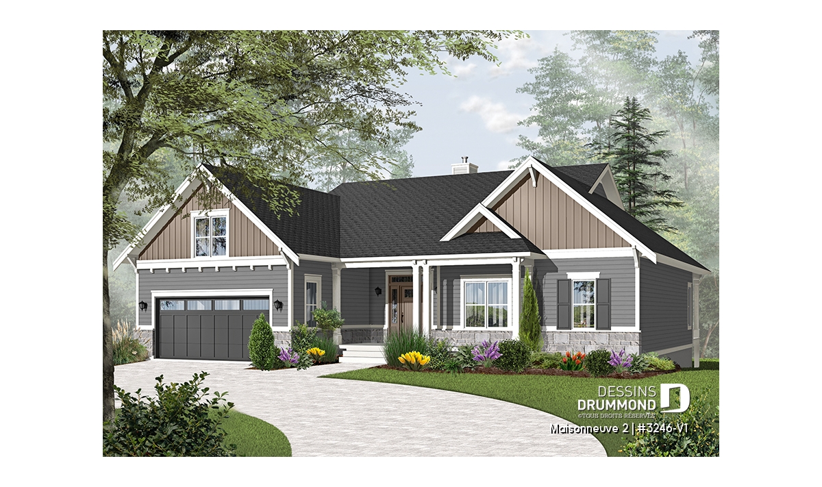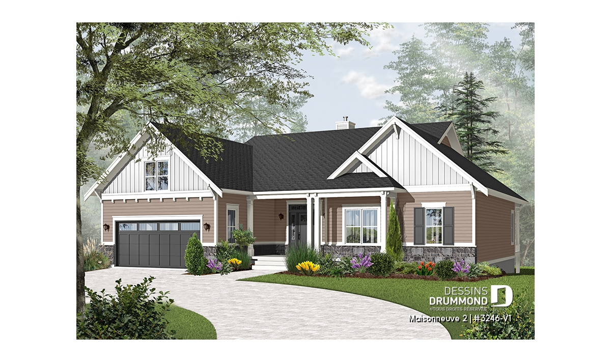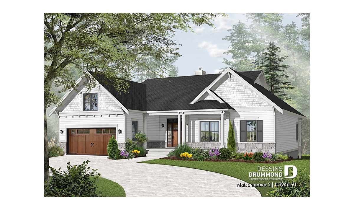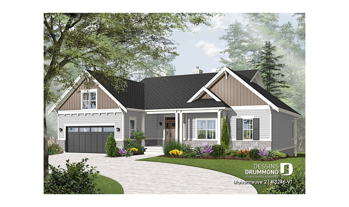Maison de style champêtre farmhouse avec garage double et sous-sol en rez-de-jardin.