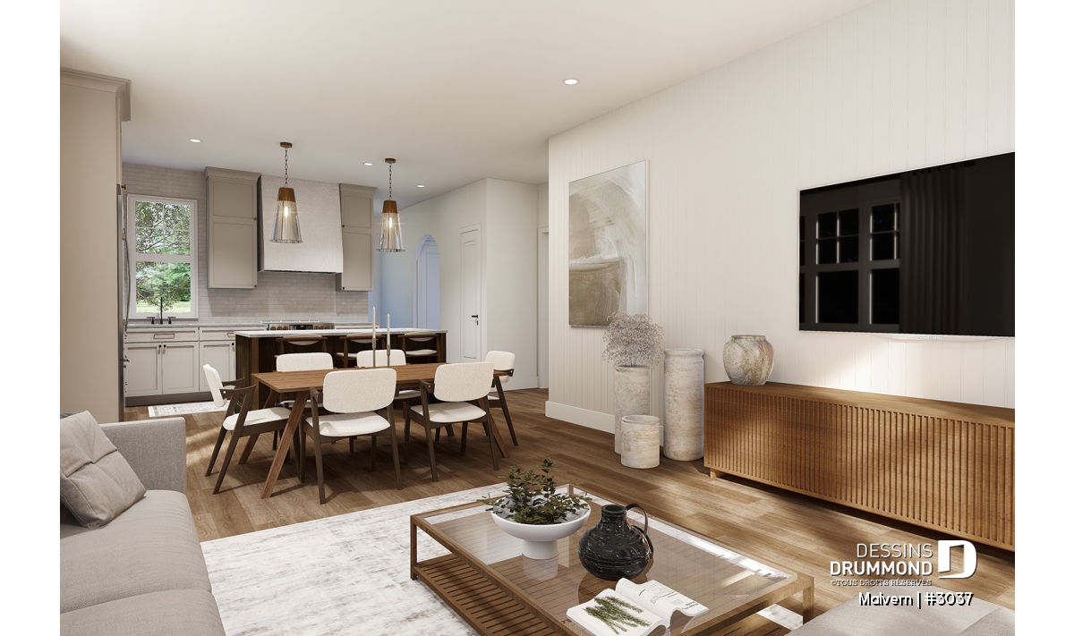 Cuisine attrayante, au logement famille (#1) avec îlot et garde-manger et ouverte sur le secteur salle à manger et salon.