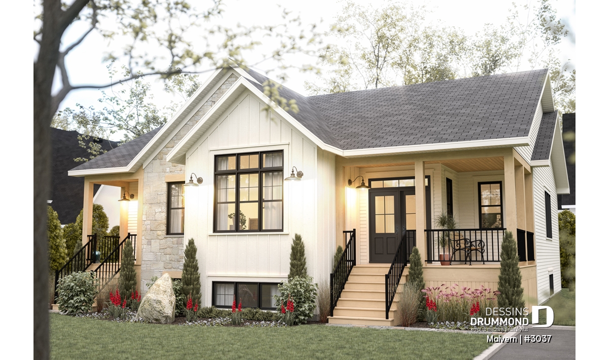 À l’extérieur, les galeries trahissent cet heureux jumelage tout en conférant un certain cachet à l’ensemble et l’aménagement de pignons ajoute une certaine envergure à la résidence.
