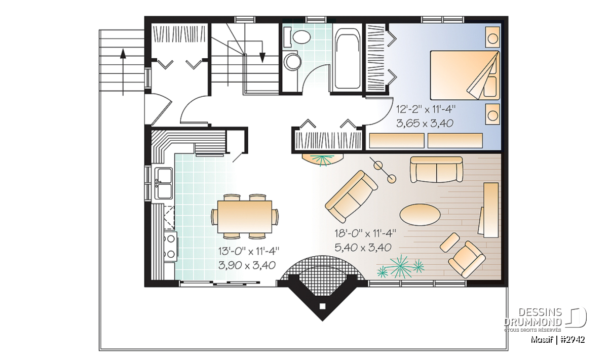 À l’intérieur, c’est un rez-de-chaussée bien organisé que l’on remarque d’entrée. Vestibule avec rangement profond, escalier vers le sous-sol attenant à l’entrée, salle de bain près de la seule chambre de ce plancher et surtout un secteur cuisine/salle à manger/salle de séjour bien orienté sur l’arrière et bien dégagé avec en plus, un plafond cathédrale pleine largeur.
