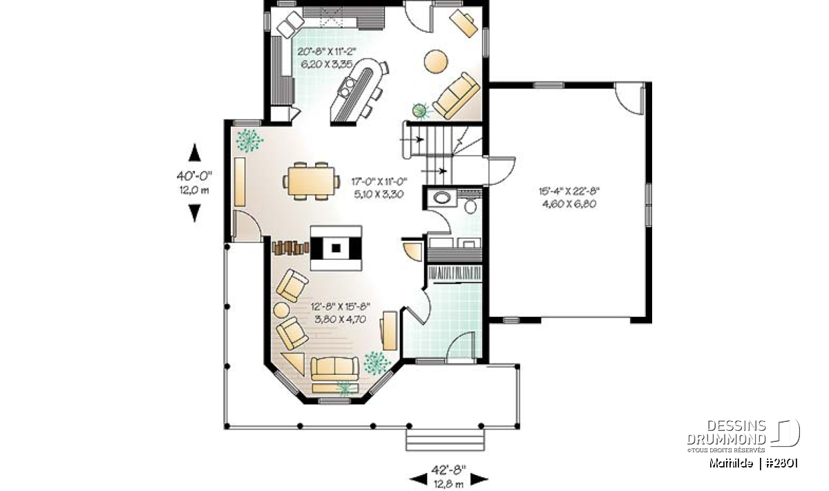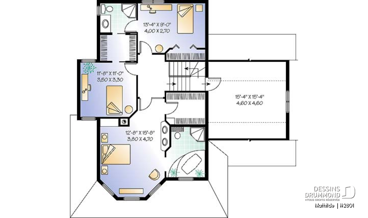Ici, rien n’échappe au concepteur. Une grande galerie avant et latérale assure l’accès à la porte principale et à une porte secondaire donnant sur la salle à manger. Un volume avant en angle et sur deux étages procure charme et lumière tant à la salle de séjour qu’à la chambre des maîtres. Un garage suffisamment imposant et aménagé à palier permet l’obtention d’un espace boni attrayant et accessible à mi-chemin entre les deux planchers.
