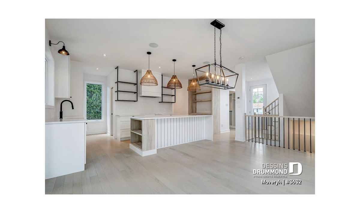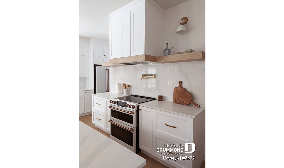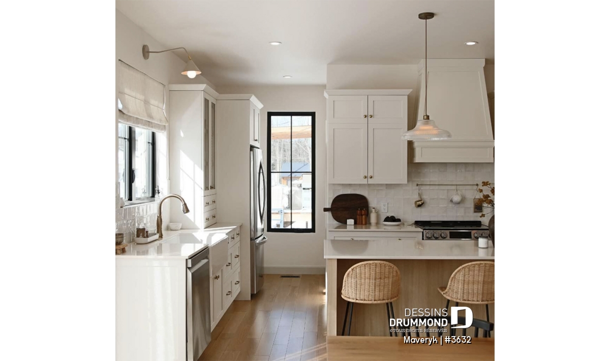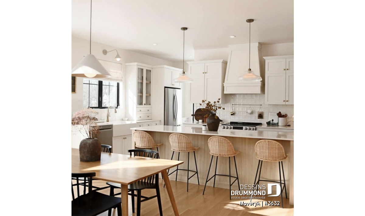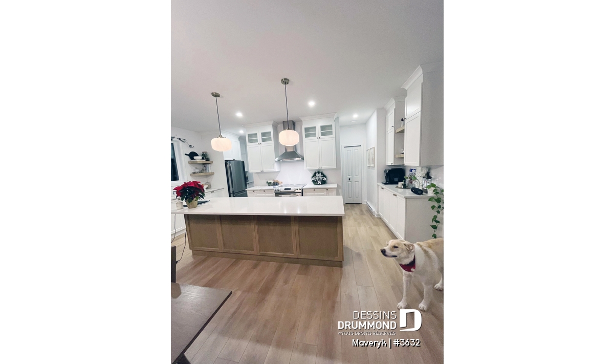 La cuisine, lumineuse et bien pensée, offre une configuration originale avec de nombreuses armoires et un vaste espace de travail. Son îlot central, ouvert sur la salle à manger et le salon avec foyer, crée une atmosphère conviviale, parfaite pour recevoir parents et amis. En retrait, on trouve un grand garde-manger et une salle d’eau discrète, pratiques et bien situés.