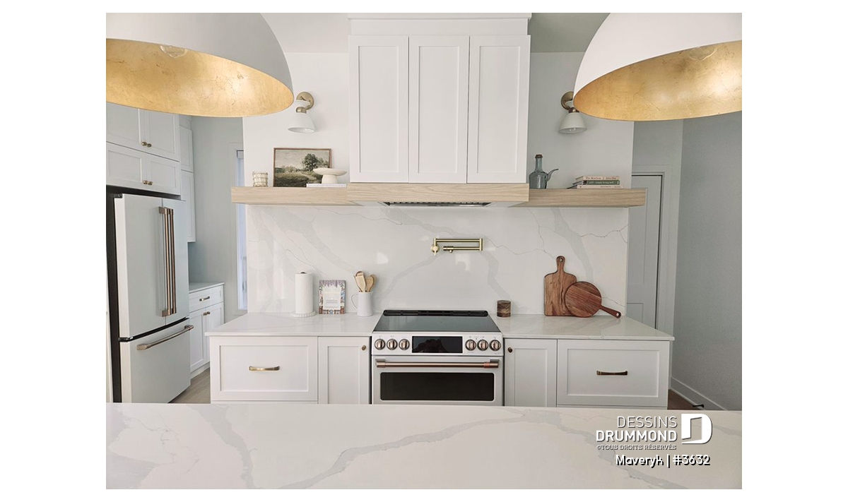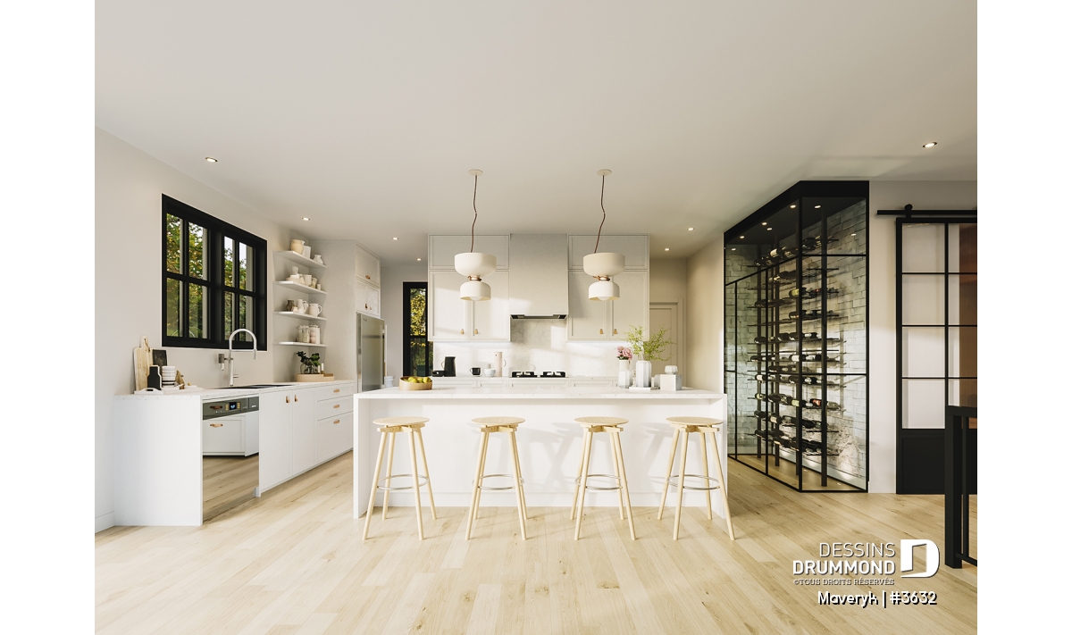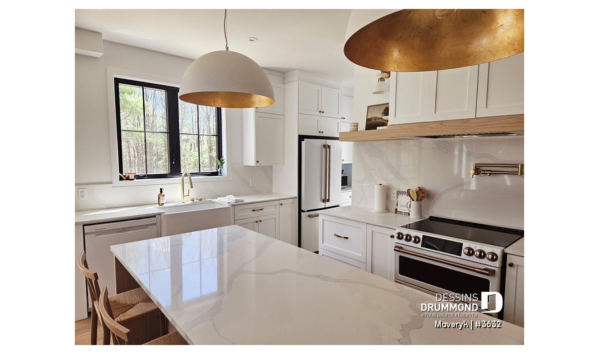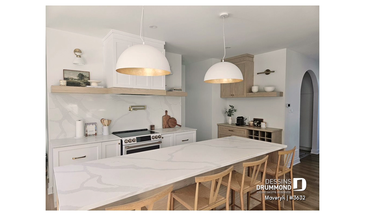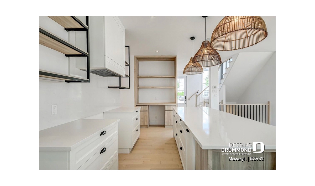 La cuisine, lumineuse et bien pensée, offre une configuration originale avec de nombreuses armoires et un vaste espace de travail. Son îlot central, ouvert sur la salle à manger et le salon avec foyer, crée une atmosphère conviviale, parfaite pour recevoir parents et amis. En retrait, on trouve un grand garde-manger et une salle d’eau discrète, pratiques et bien situés.