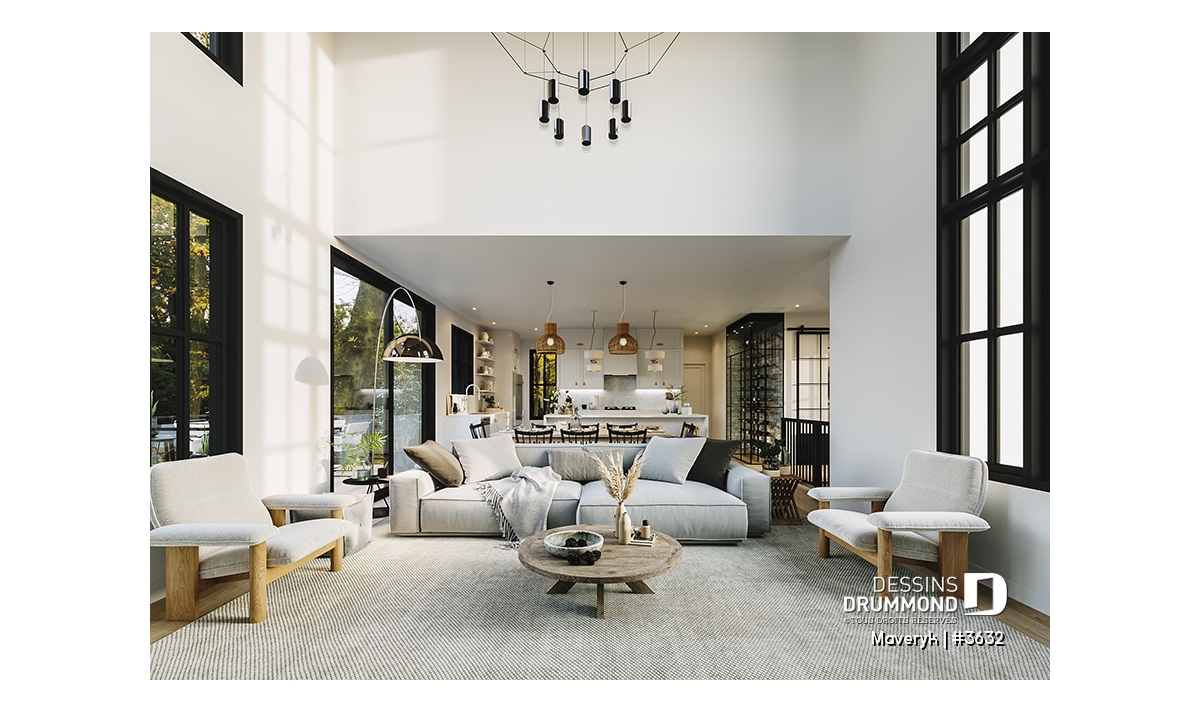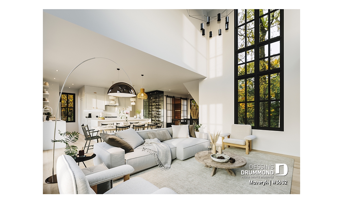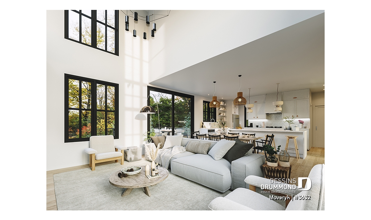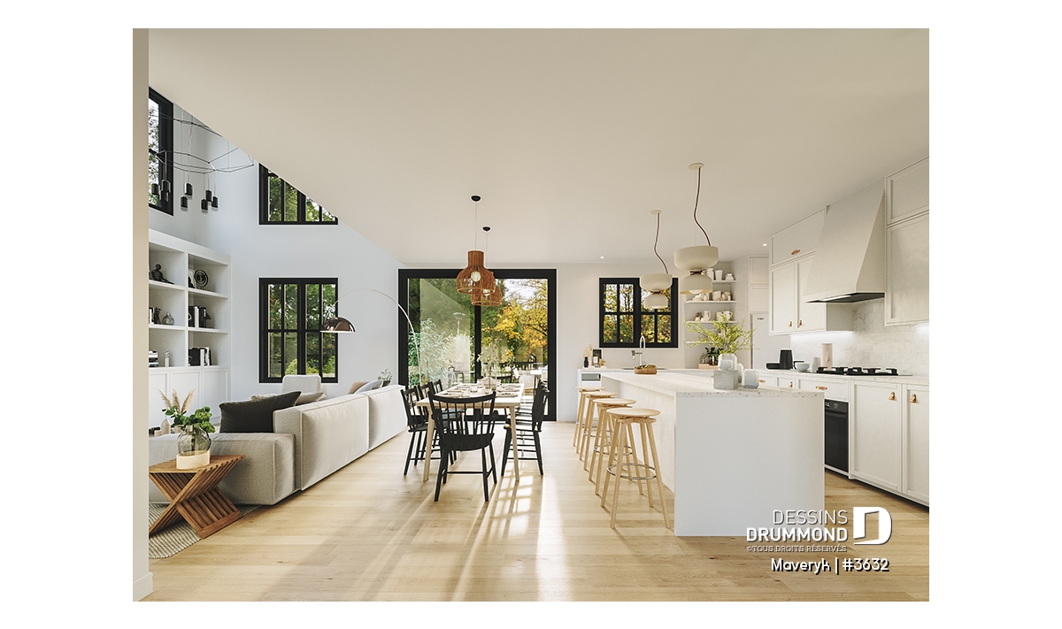 Superbe lumière naturelle à l’arrière, dans la grande aire ouverte regroupant la cuisine, la salle à manger et le salon.