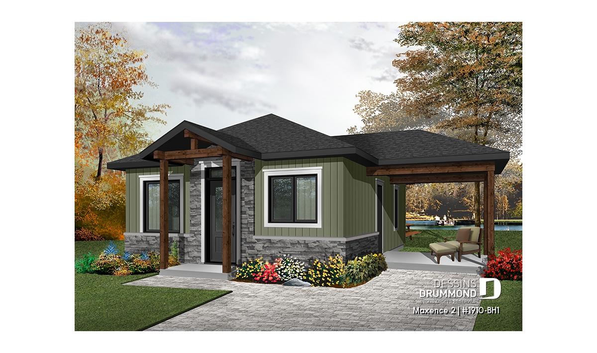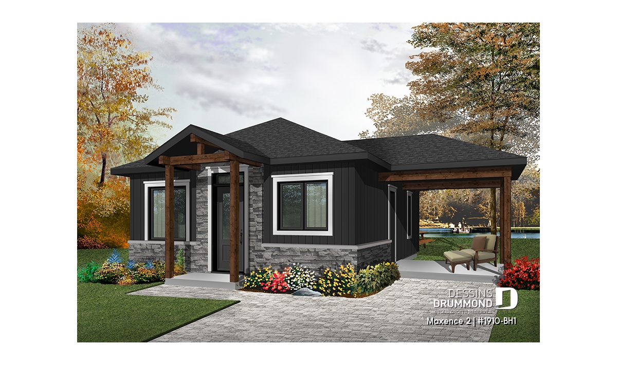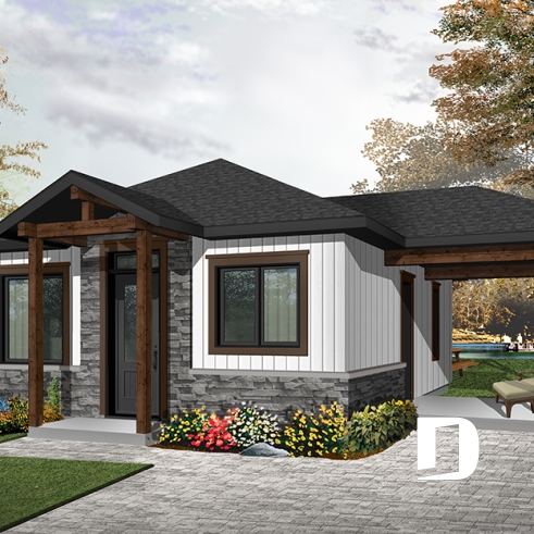 Plan de maison moderne rustique, 2 chambres, aire ouverte à la cuisine et salle familiale, grand patio couvert