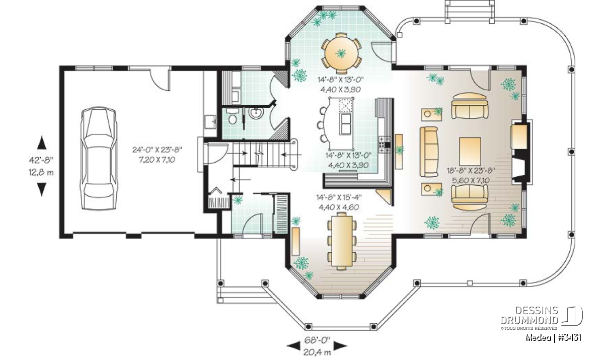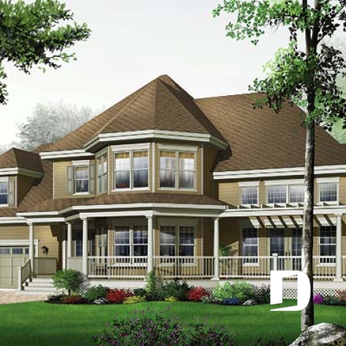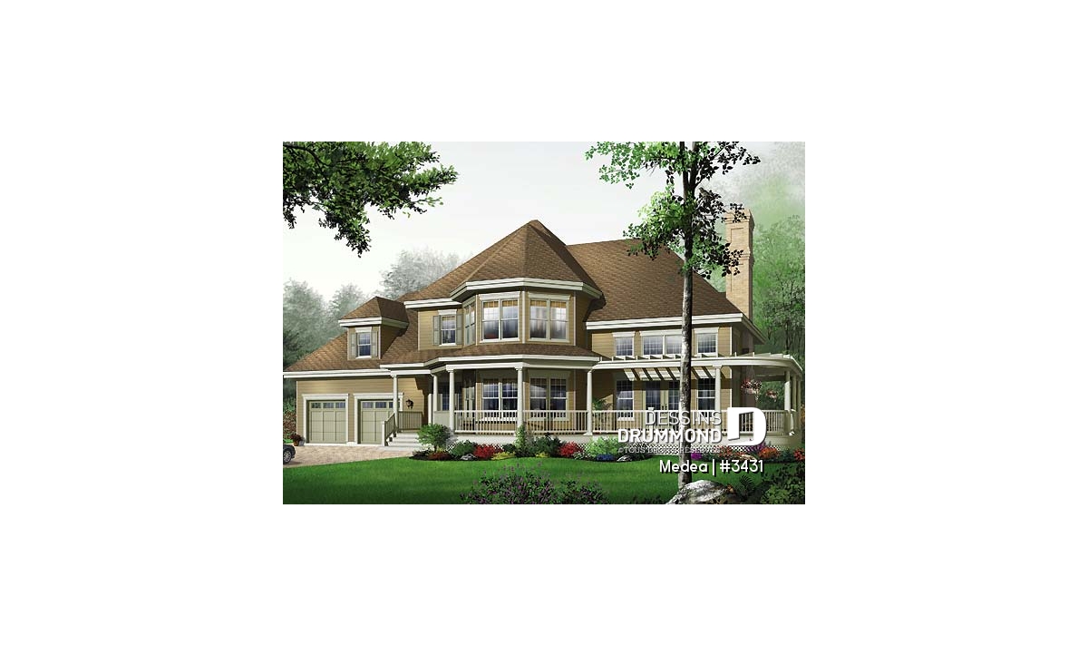 Galerie extérieure originale, avec pergola, sur trois façades. Vaste salle familiale, ouverte sur deux étages, avec fenestration abondante et module imposant intégrant la télé et le foyer. Plafond à 8'-6" ailleurs au rez-de-chaussée. Salle à manger, dînette et chambres secondaires en volumes à angles abondamment fenestrés. Suite chambre des maîtres tout à fait champêtre avec belles garde-robes séparées, lucarnes et salle de bain surélevée. Salle de séjour en mezzanine à l'étage avec portes pleine largeur pour amenuiser le bruit en provenance de cet espace ou de la salle familiale.