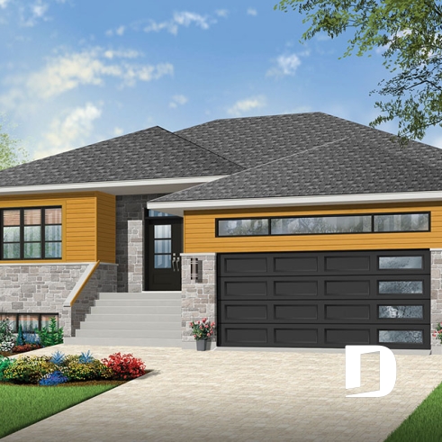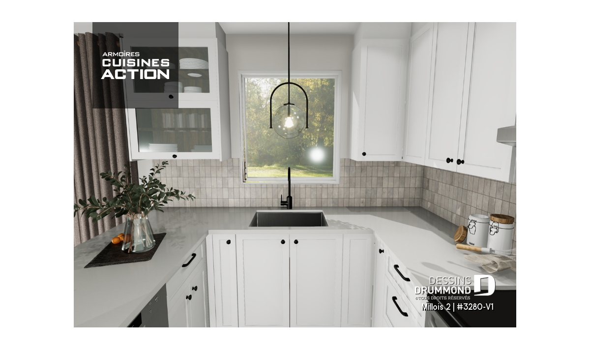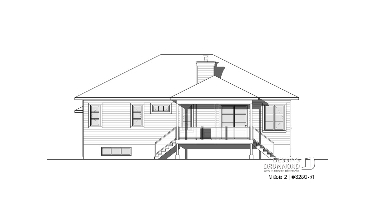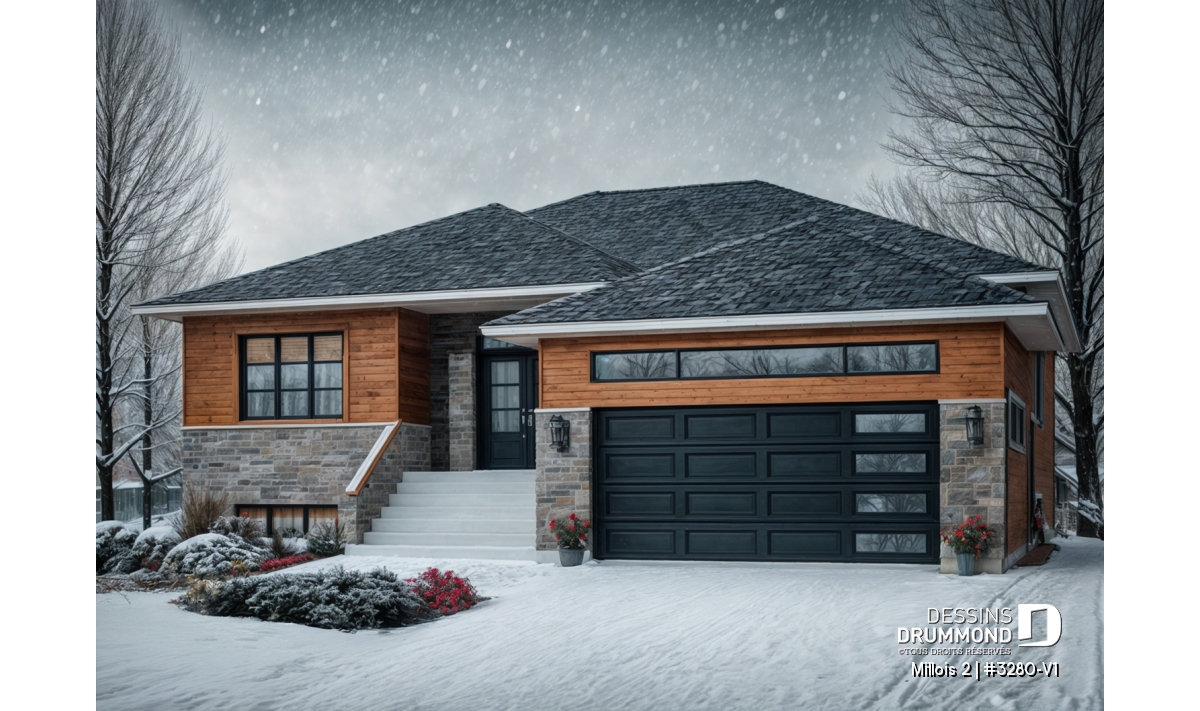 Suite à un sondage réalisé sur notre site www.dessinsdrummond.com et mettant en vedette trois aménagements intérieurs de rez-de-chaussée, j’ai mis de l’avant, pour ce modèle 3280-V1, l’aménagement intérieur ayant récolté le plus de votes. D’ailleurs, parce que ce modèle se veut une version du très populaire 3280 d’origine, on reconnaît ici les lignes qui furent appréciées sur le plan initial comme cet élégant toit 4 versants, ces murs extérieurs habillés d’une maçonnerie que l’on marie à une touche de bois à l’horizontale.