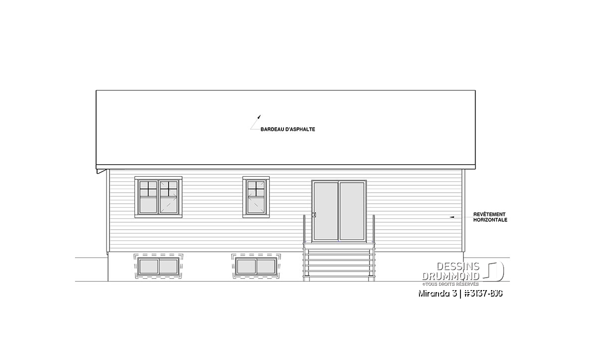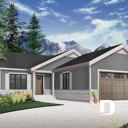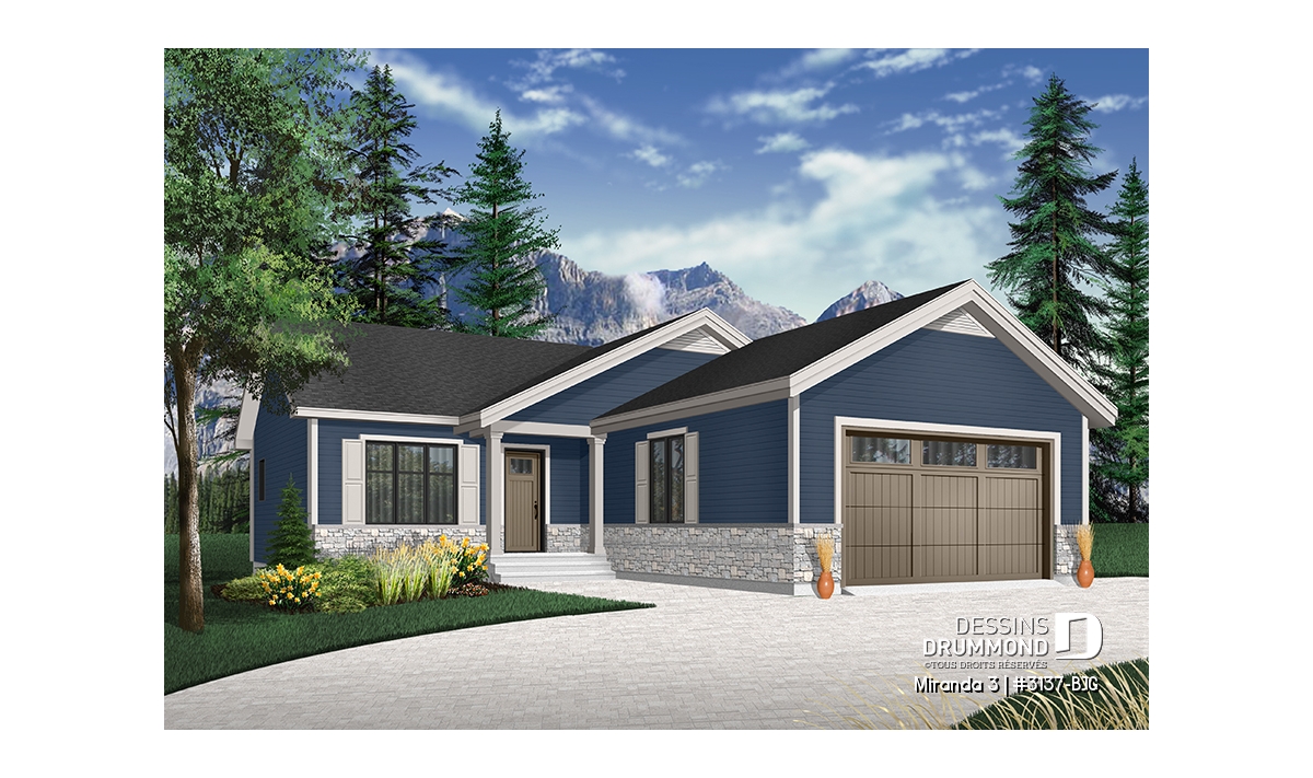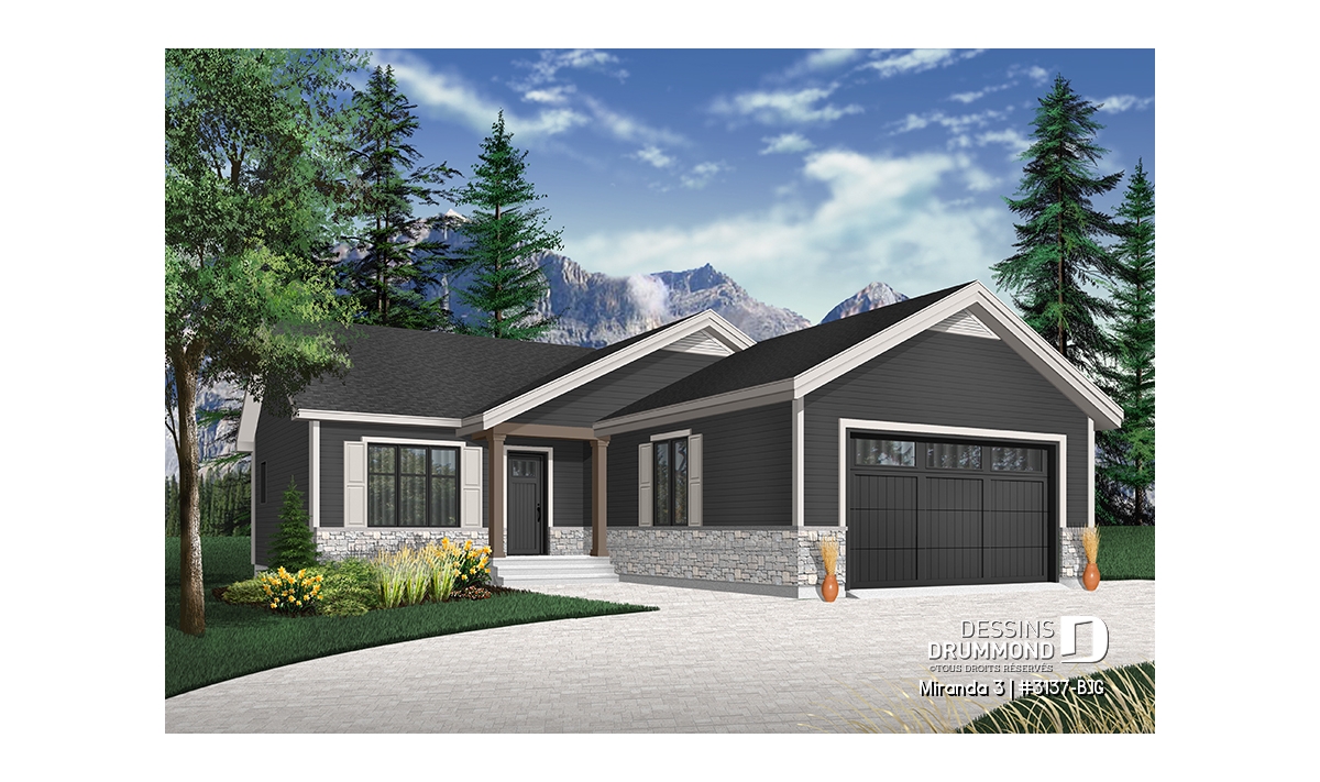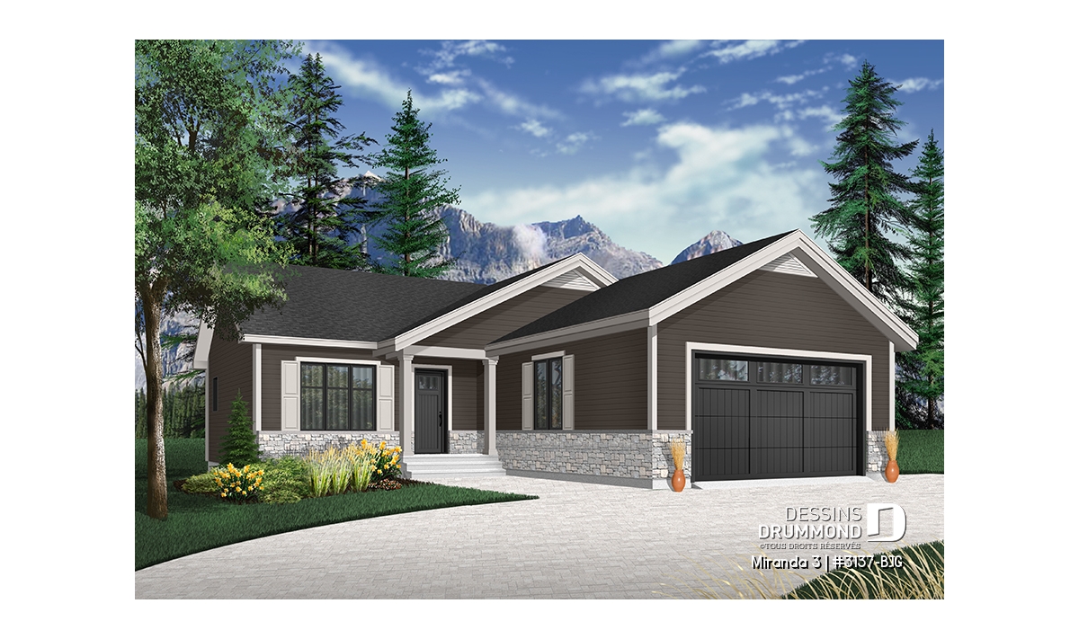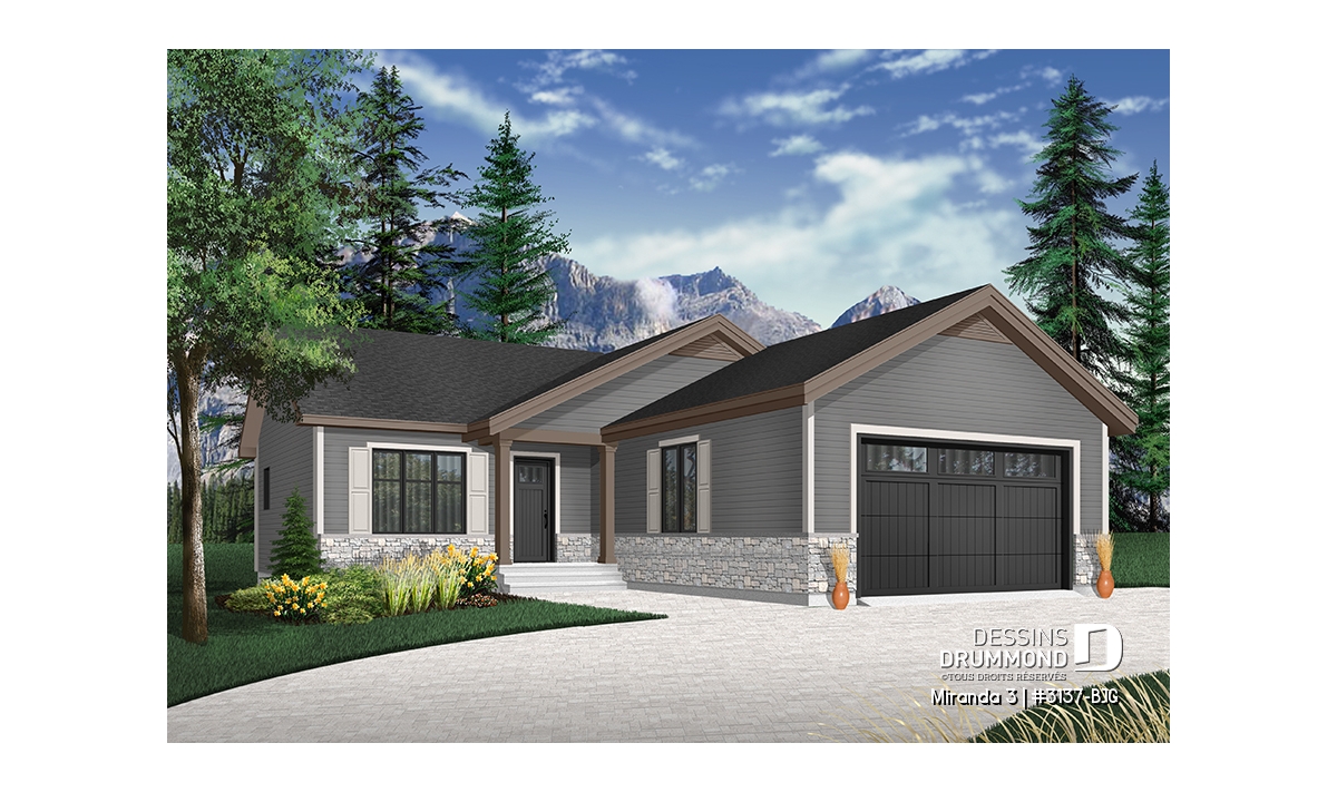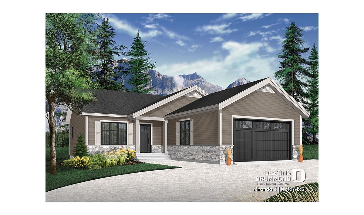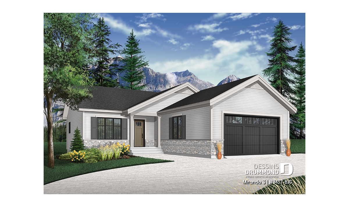 Le modèle de base, Miranda, a plu assurément de par son coût abordable et son allure moderne rustique, deux éléments populaires et recherchés par les acheteurs de première maison. Nous avons donc imaginé et conçu la version avec garage double en façade, soit la Miranda 2, idéale pour terrain étroit, car c’est une demande constante des clients qui ont visité nos agences Dessins Drummond afin de faire des modifications à ce modèle. De plus, fait non négligeable, le garage double offre un accès à la maison par l'entrée principale et aussi par le sous-sol.