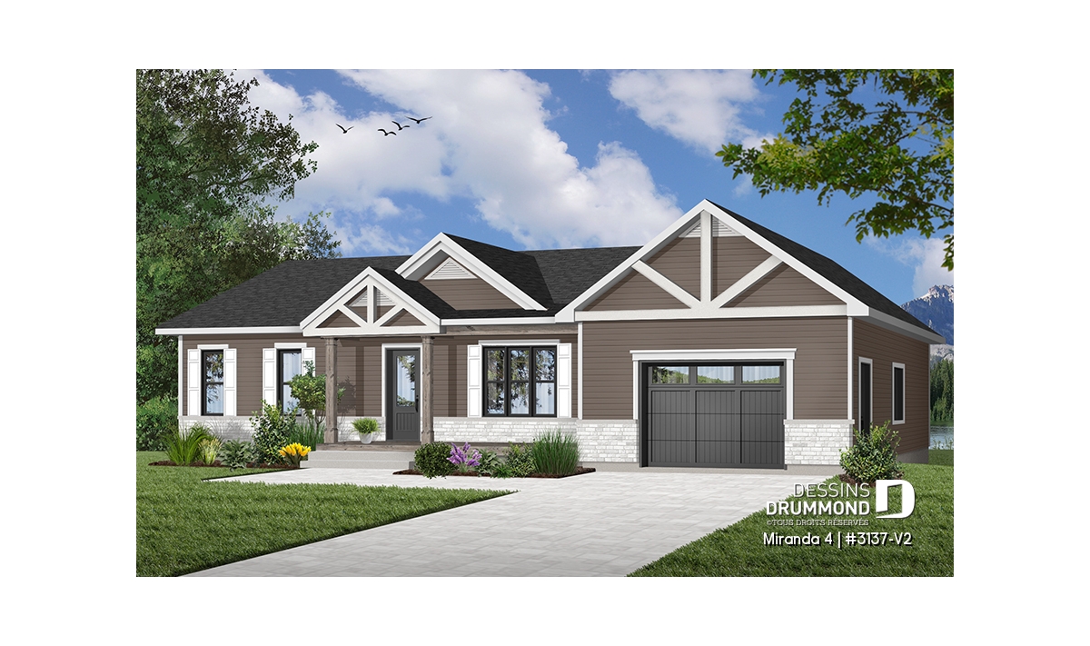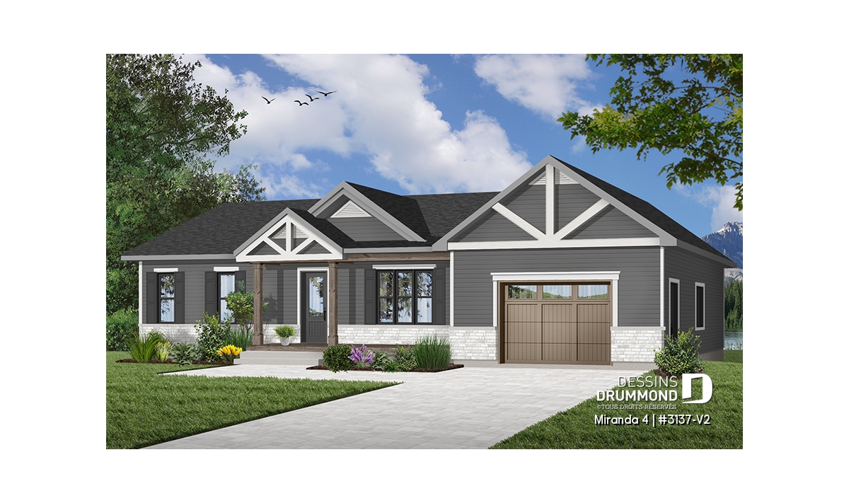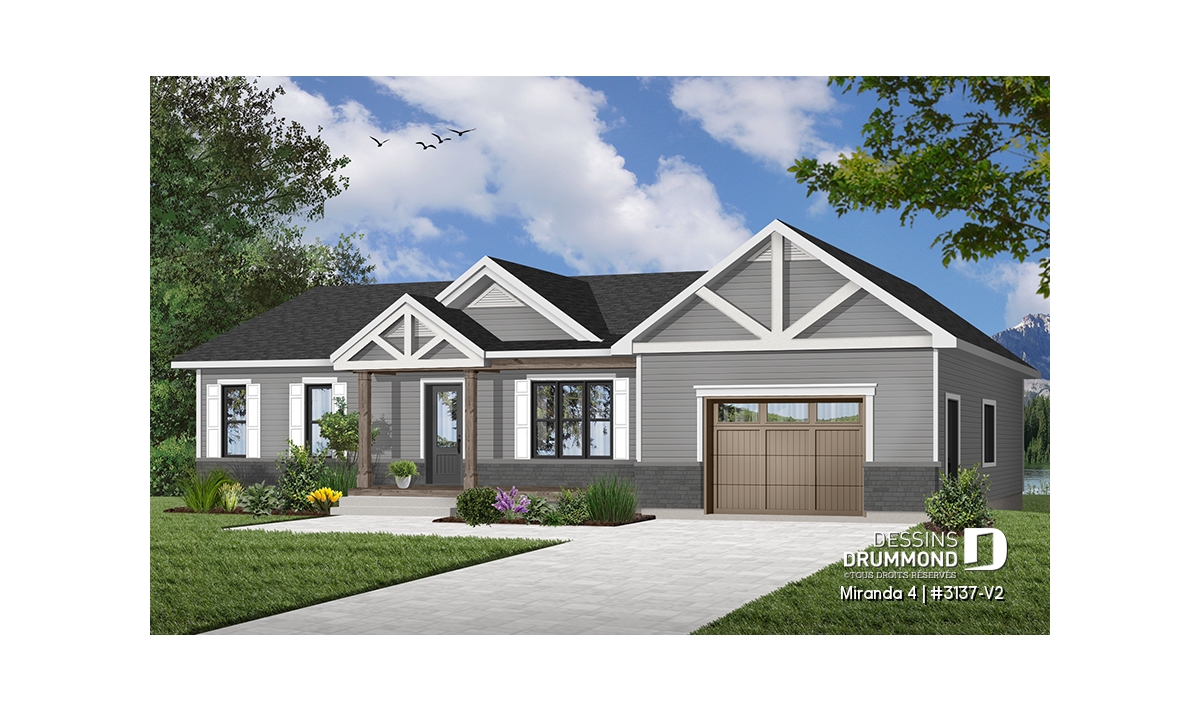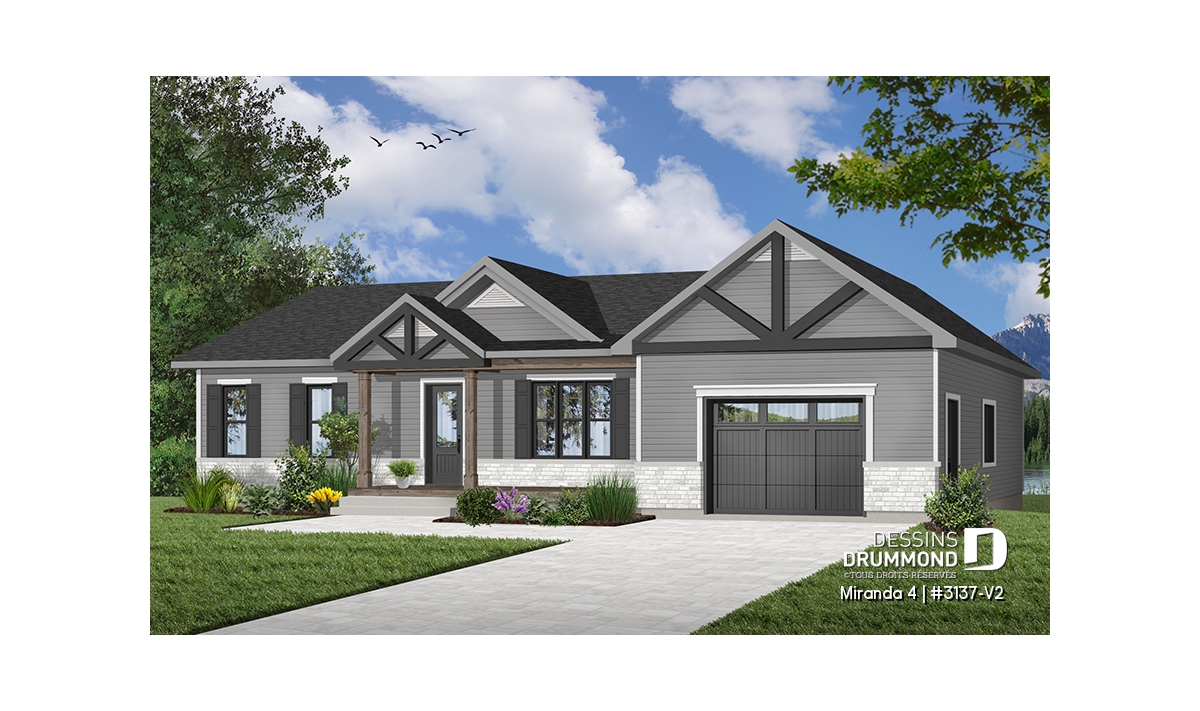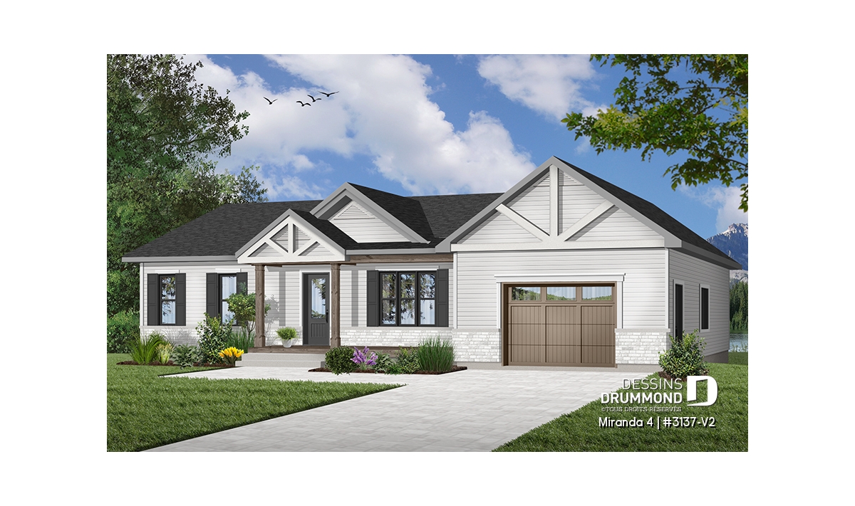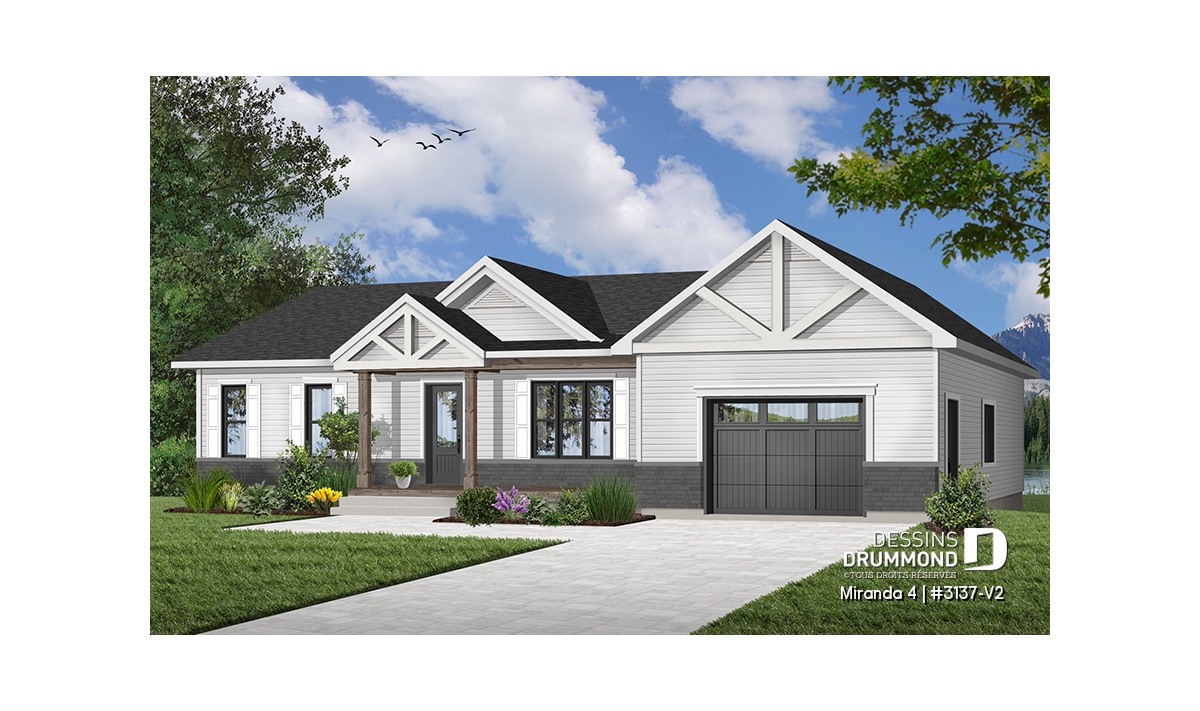 Le modèle de maison Miranda 4 (#3137-V2) est un plain-pied au style champêtre rustique et actuel, qui séduit d’emblée par son prix très accessible et son garage intégré. Conçu pour répondre aux attentes des acheteurs de première maison, ce modèle propose un équilibre réussi entre fonctionnalité, confort et charme, sans superflu.