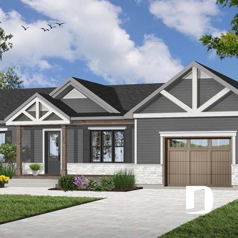 Plain-pied au style champêtre actuel, combinant garage intégré et prix très accessible, idéal pour un premier projet.