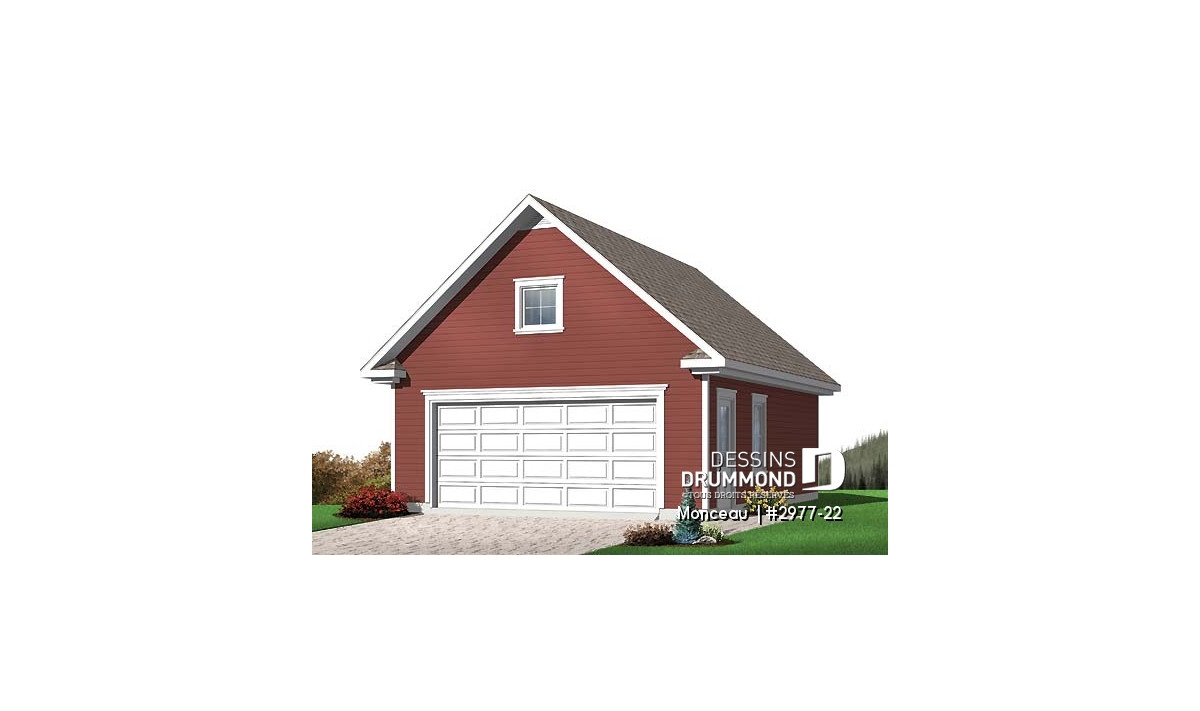 Plan de garage double, pour deux voiture, avec porte et fenêtre latérales. Espace rangement au grenier.