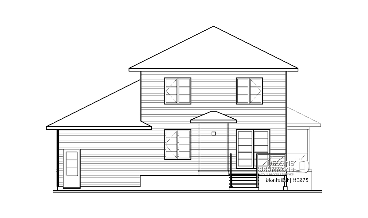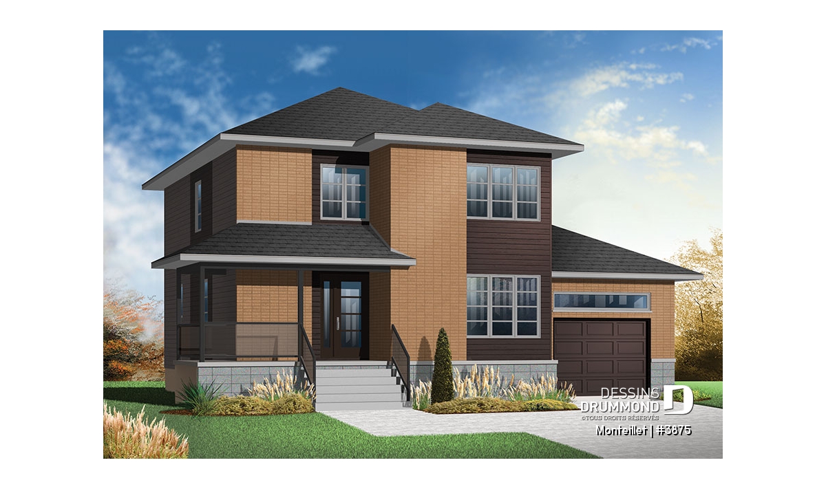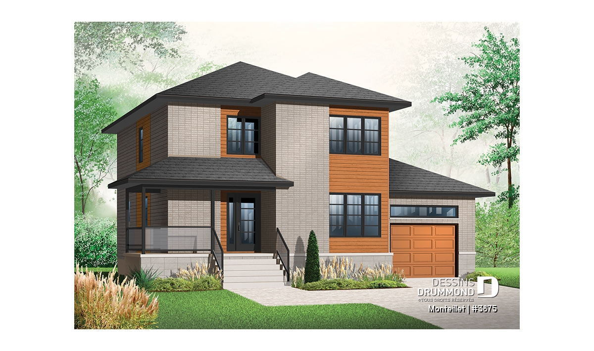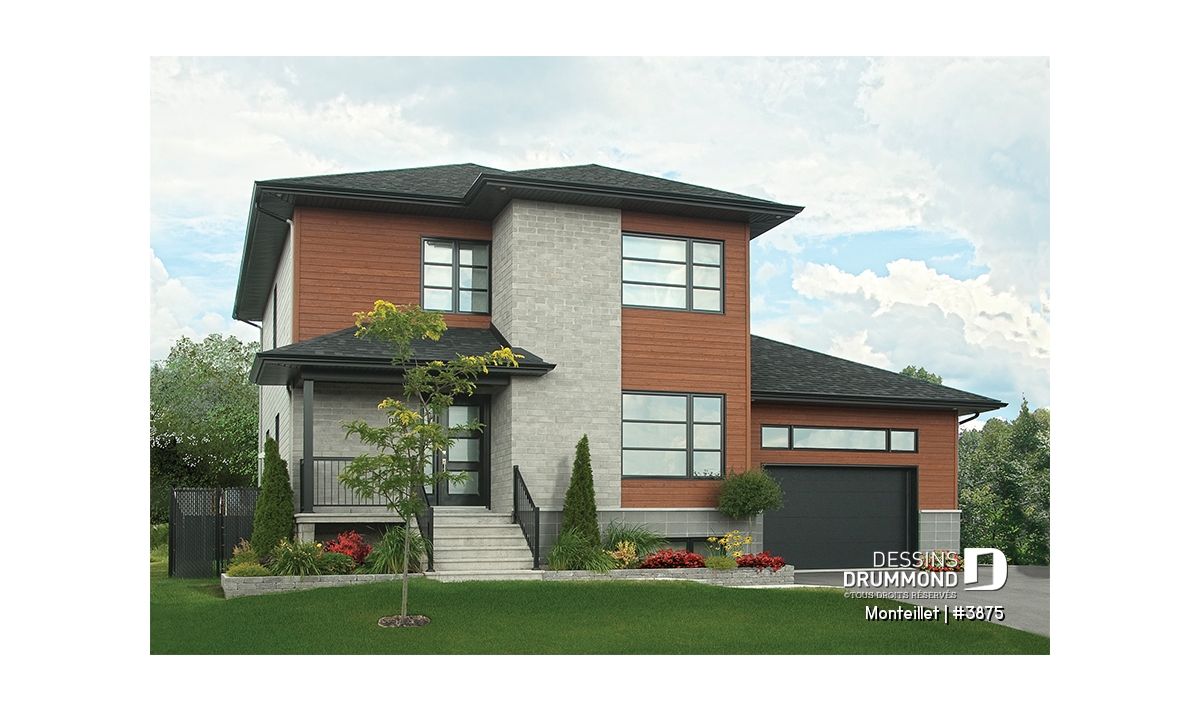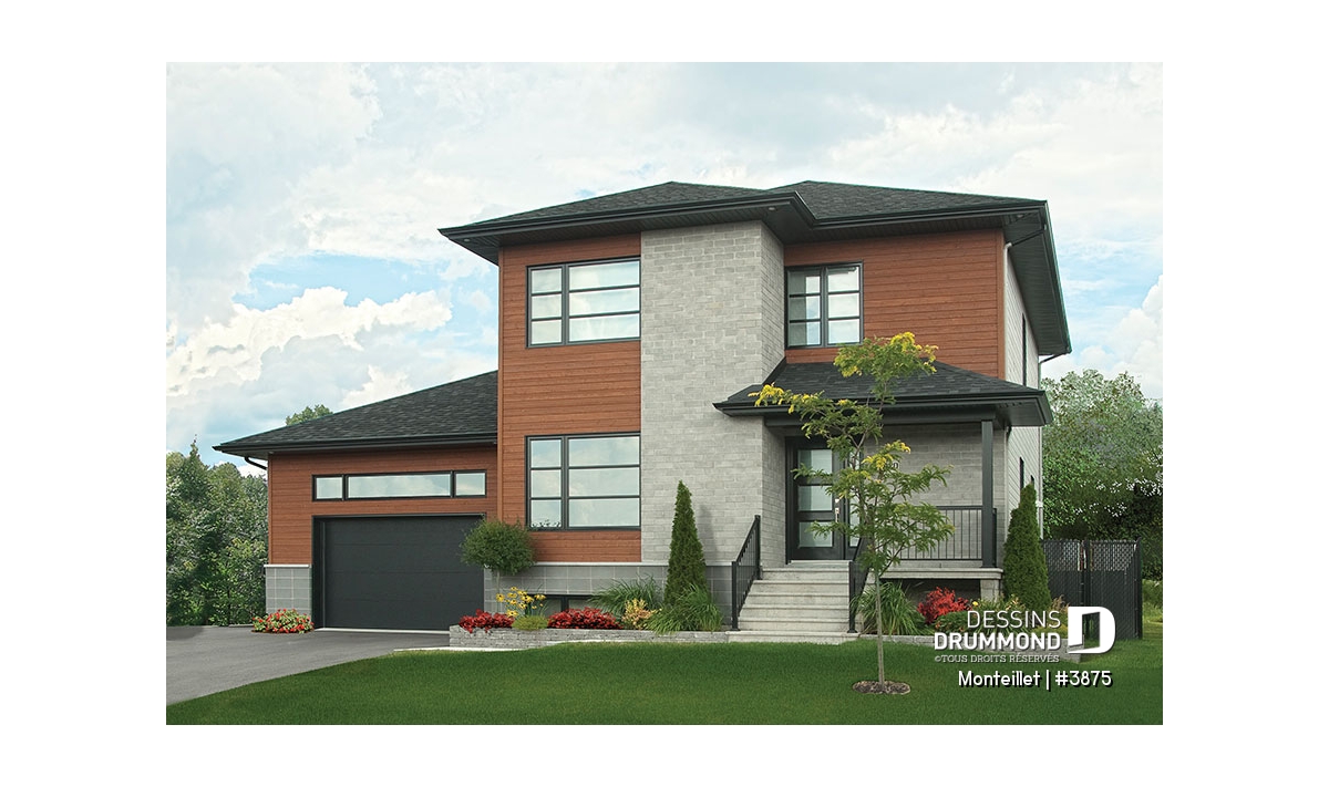 Remodelée à partir du très populaire modèle champêtre 3820, ce cottage prend une toute autre allure lorsqu’on lui applique un style contemporain avec des matériaux plus durables comme le bloc architectural, la brique et le bois. Autre différence à signaler, l’ajout de plus de 330 pi2 par rapport au modèle 3820; pi2 attribués en partie au rez-de-chaussée et surtout à l’étage pour lequel ce volume en saillie, que l’on voit à l’avant et qui est réservé uniquement au rez-de-chaussée sur le 3820, passe ici à deux étages et contribue à ce tout nouveau « look » extérieur.
