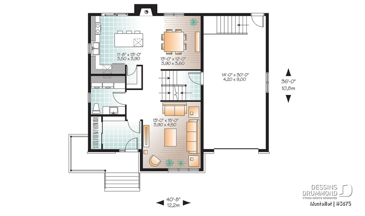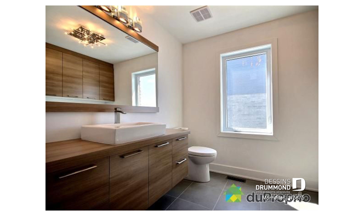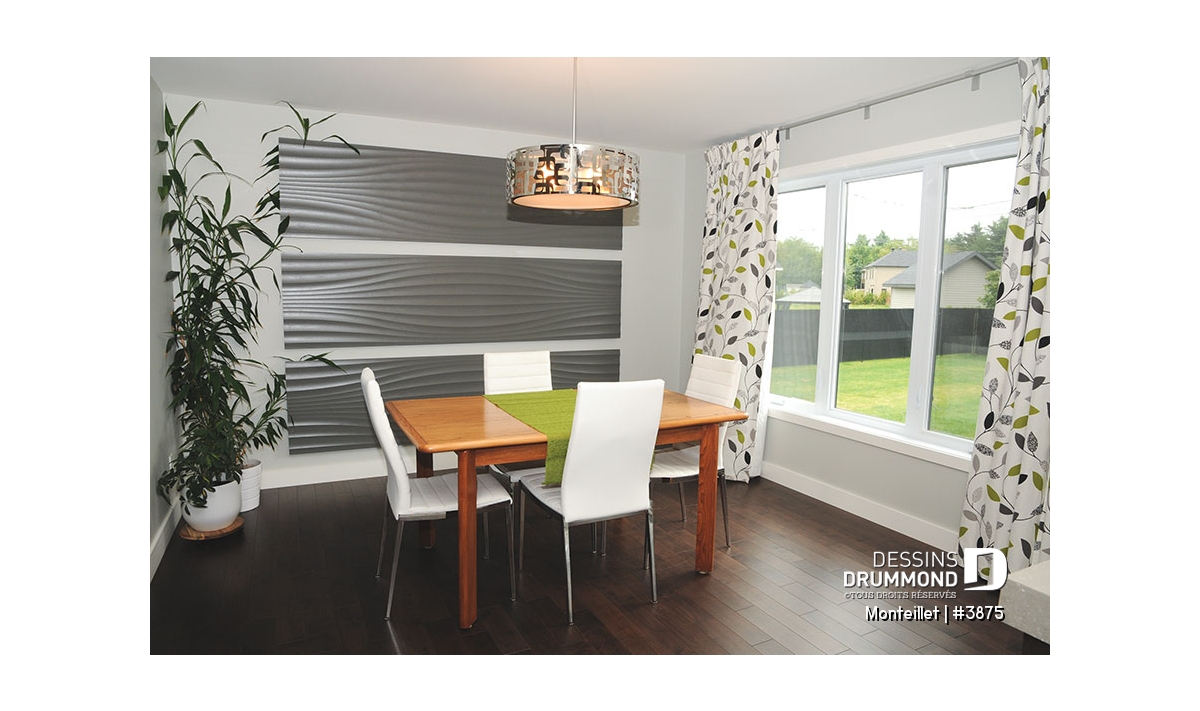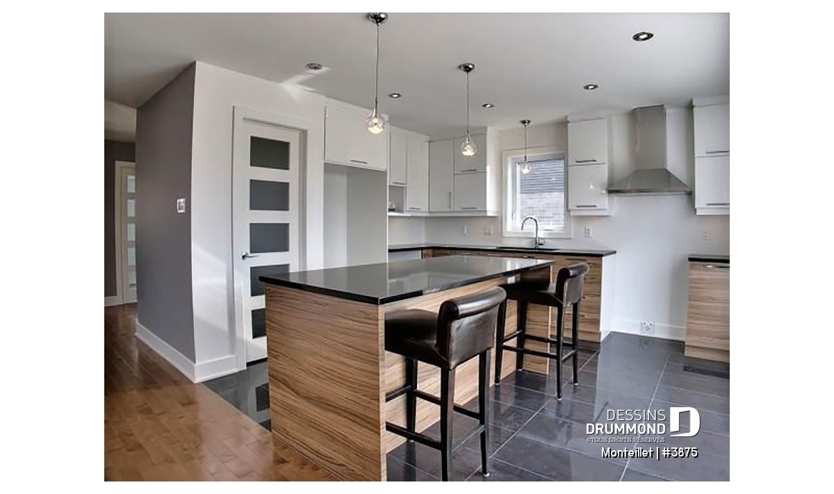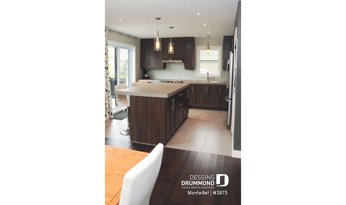 À l’intérieur, l’approche contemporaine se traduit par l’obtention de cloisons droites et d’espaces suffisamment ouverts. Que dire de ce combo cuisine/salle à manger agrémenté d’un îlot-lunch de plus de 6’x3’ avec cellier intégré, d’un garde-manger de type walk-in et d’un foyer mural aménagé au centre des deux pièces. Sans oublier, toujours au rez-de-chaussée, un vestibule remarquable avec garde-robe de 6’ de longueur.