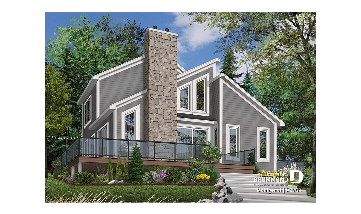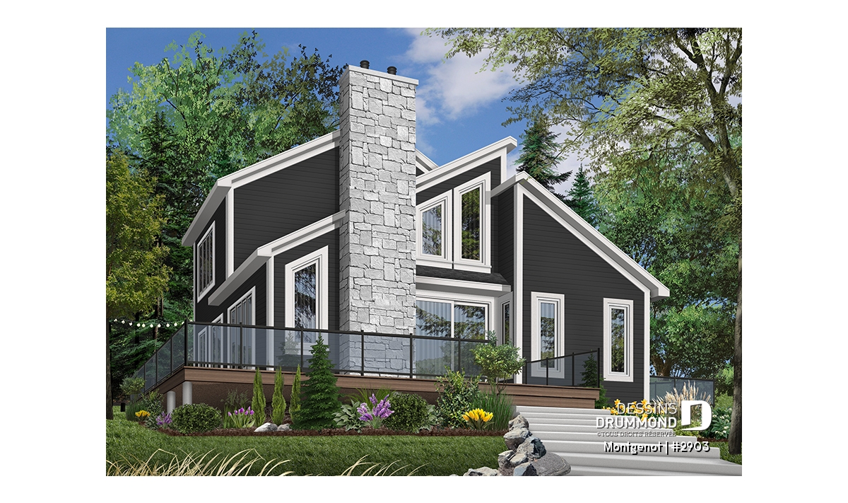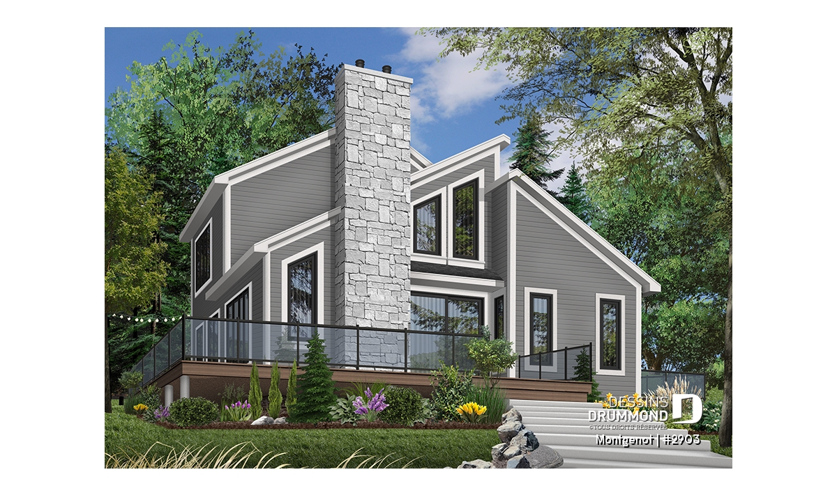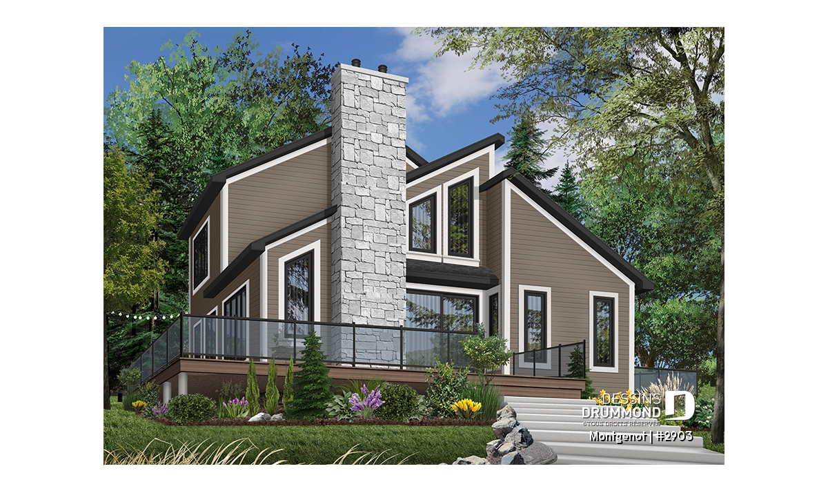 Version couleur no. 2 - Vue avant - Plan de chalet panoramique, chambre des maîtres à l'étage, mezzanine, cuisine avec îlot, plafond cathédrale - Montgenot