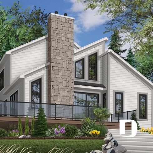 Plan de chalet panoramique, chambre des maîtres à l'étage, mezzanine, cuisine avec îlot, plafond cathédrale