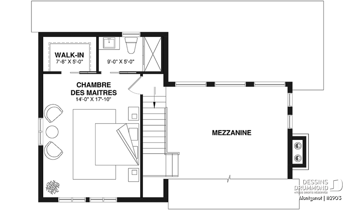 Étage - Plan de chalet panoramique, chambre des maîtres à l'étage, mezzanine, cuisine avec îlot, plafond cathédrale - Montgenot