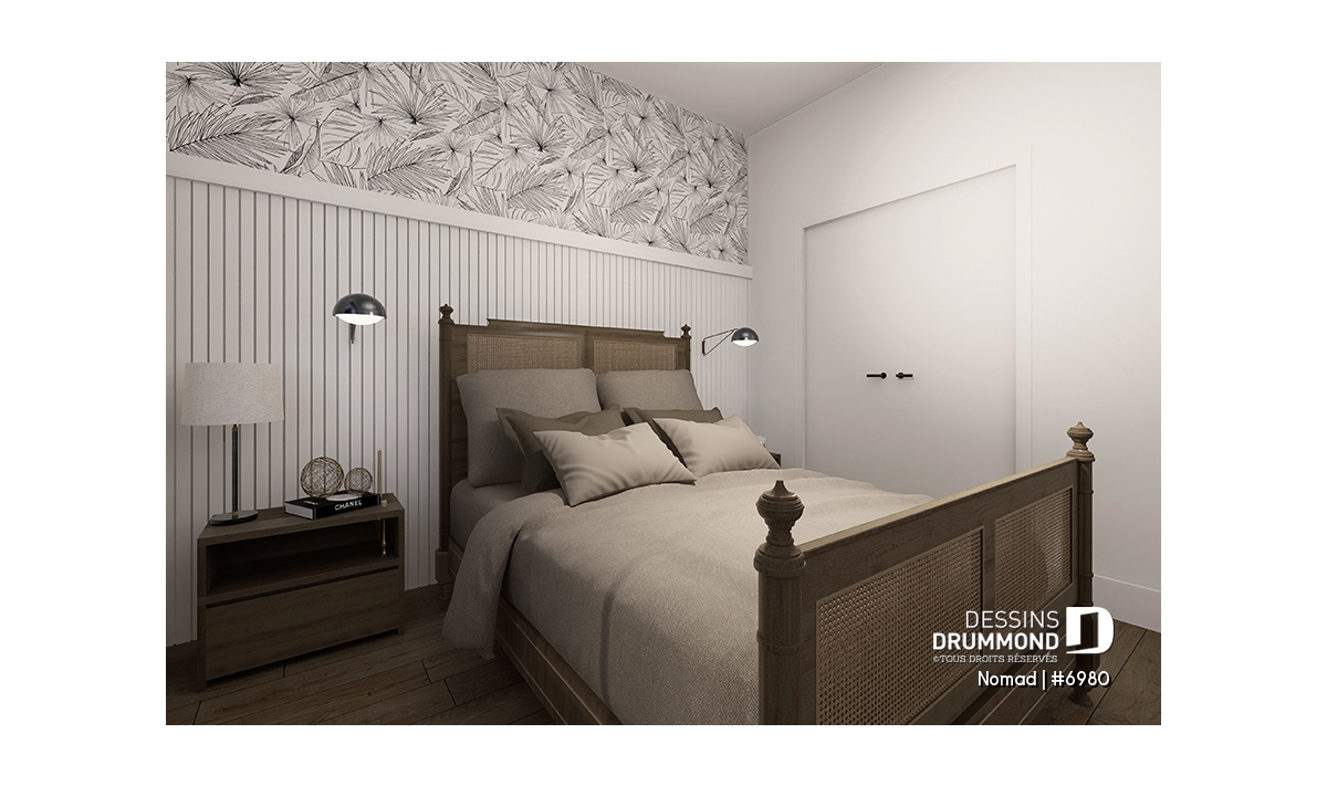 Le plafond de l'espace habitable du plan NOMAD est à 9' de hauteur donnant un effet d'amplitude à ce modèle de petit format. Le perron avant est abrité, accueillant ainsi les visiteurs tout en les protégeant des intempéries. Une pratique garde-robe, près de l’entrée avant, pourra recevoir vestes et manteaux, si la température le nécessite. La seule chambre prévue à cette maison reçoit une belle lumière naturelle par la grande fenêtre à l’avant. Elle possède également une garde-robe de format régulier. La cuisine offre un bel îlot de 7’8’’ x 2’6’’ et reçoit également une luminosité naturelle de la porte patio menant vers la terrasse couverte latérale. Une portion de cette terrasse n’est pas couverte. Le secteur cuisine, salle à manger et salle de séjour sont à aire ouverte, favorisant ainsi une belle communication entre les occupants lors de rencontre entre amis ou en famille. La salle de bain offre un bain (avec douche), une laveuse/sécheuse superposées ainsi qu’une petite lingerie.