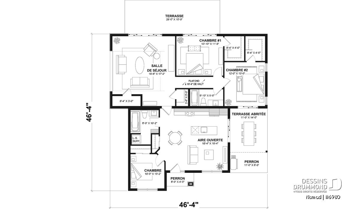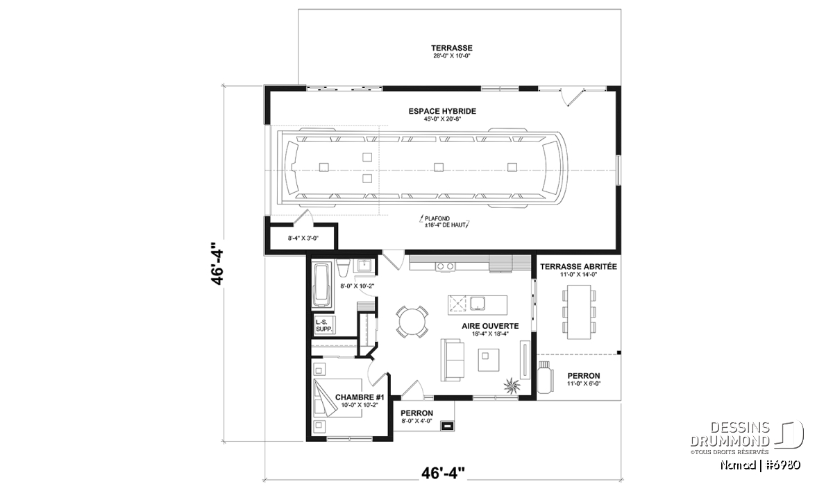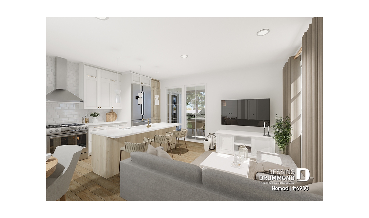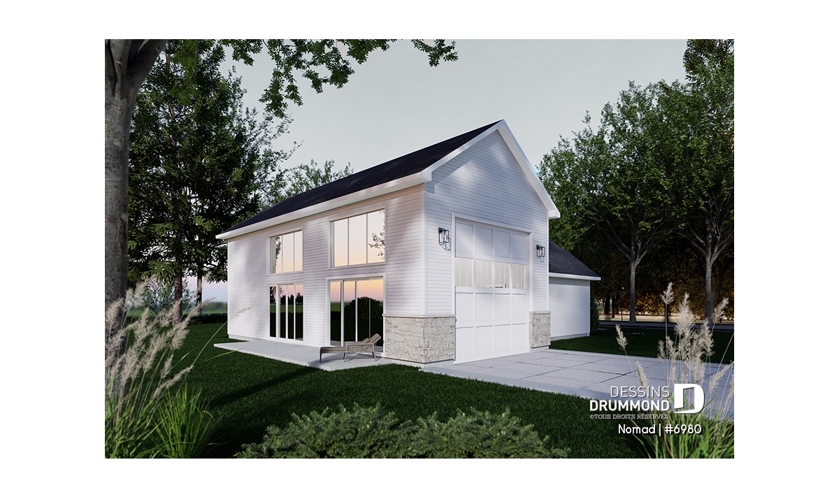 Le plan de base de la maison NOMAD (plan #6980) propose un plancher de 650 pi.ca. aménagé sur un niveau. Le garage attaché pour VR est de format 45' x 20'-8'', soit 1119 pi.ca., et deux porte-patios doubles y sont aménagées permettant l’ajout éventuel d’une terrasse ou un patio vers la cour arrière (terrasse ou patio non inclus dans l’estimation de nos coûts). De plus, le plafond du garage pour VR est à 16'4'' de hauteur. Une magnifique et grande terrasse latérale abritée est accessible autant de la cuisine que du garage (coûts inclus dans notre estimation). La fondation de cette maison est sur dalle flottante, mais il est à noter que d’autres options de fondation sont disponibles sur notre site internet, ou via notre service de modification de plan; nous contacter pour les détails.