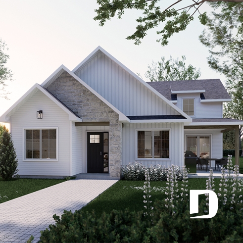 *L'estimation du coût de construction est pour le plancher de base uniquement. Pour ce plan #6980, elle inclut la terrasse latérale couverte, mais exclut la dalle pour patio à l'arrière.