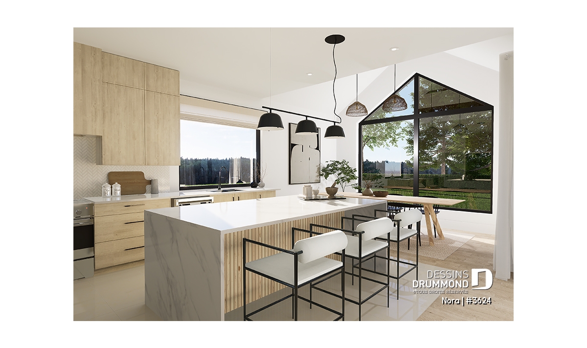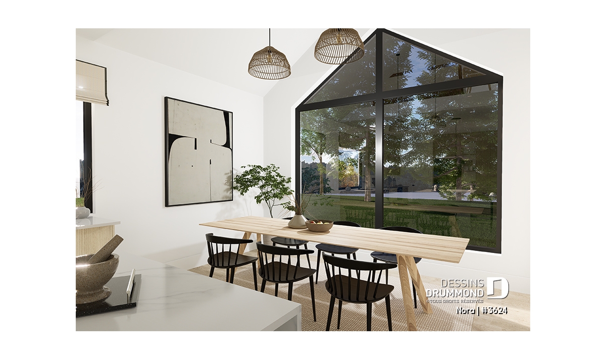 Salle à manger ouverte sur la cuisine, mise en valeur par son impressionnant plafond cathédrale.
