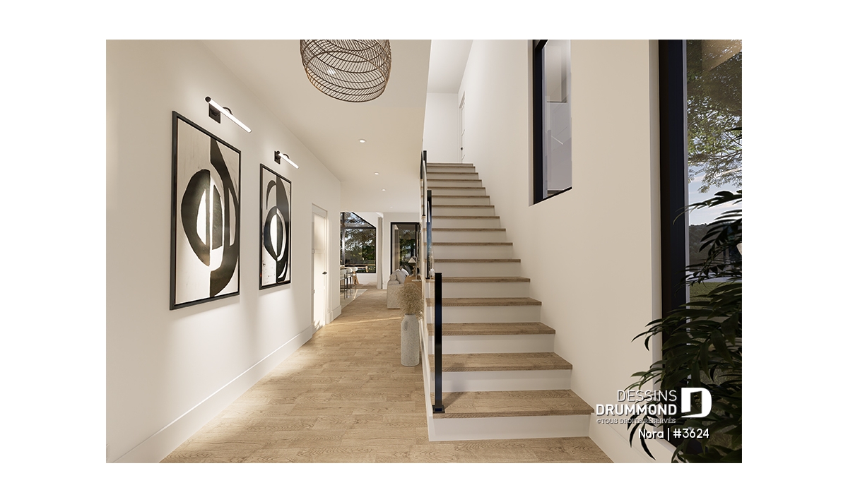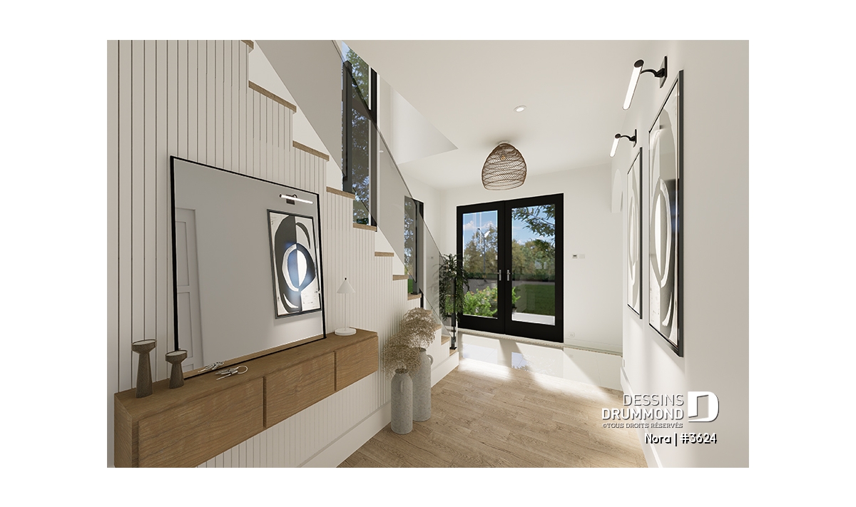 Dès l’extérieur, le perron avant abrité attire le regard avec son style sobre et pratique. On y retrouve un petit espace prévu pour le rangement du bois de chauffage, un clin d’œil à la chaleur et à la convivialité qui règnent à l’intérieur.