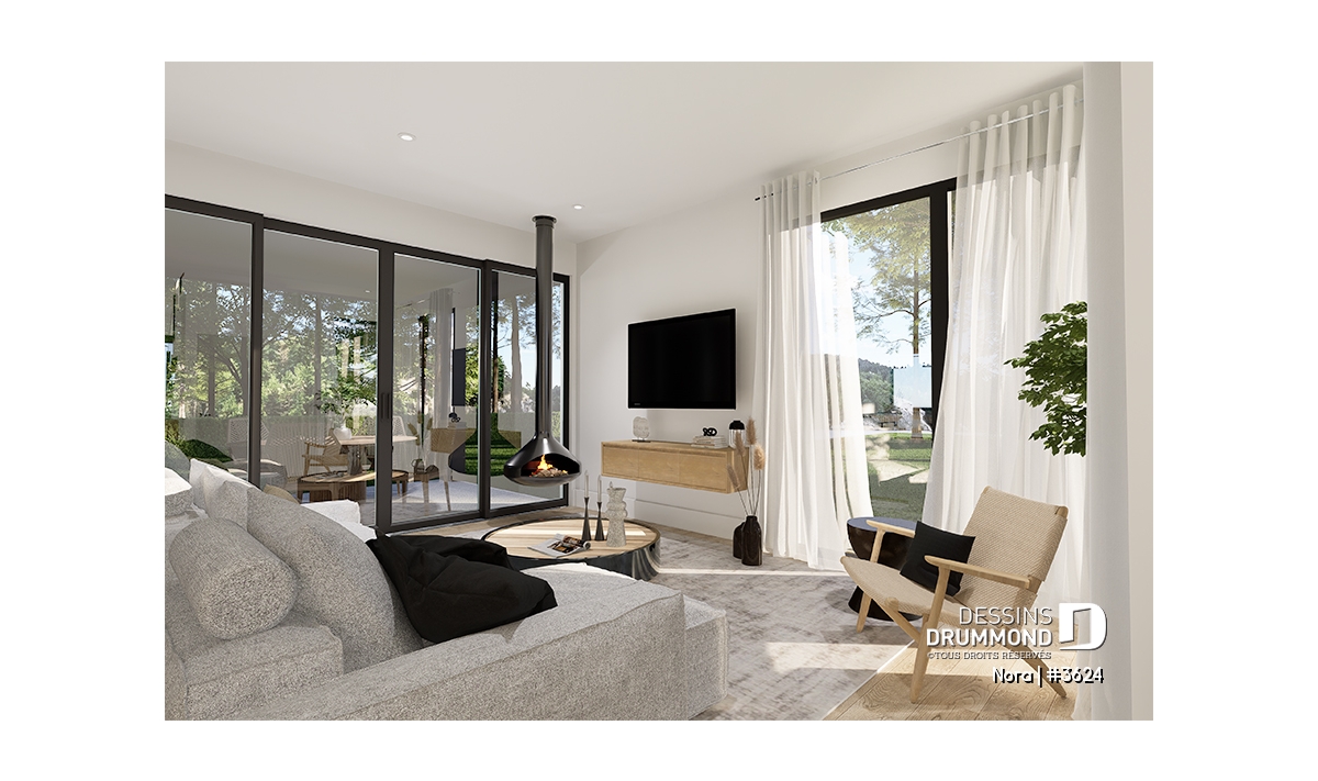 Salle de séjour lumineuse avec foyer à bois de style STÛV, positionné en coin pour une touche contemporaine et chaleureuse.
