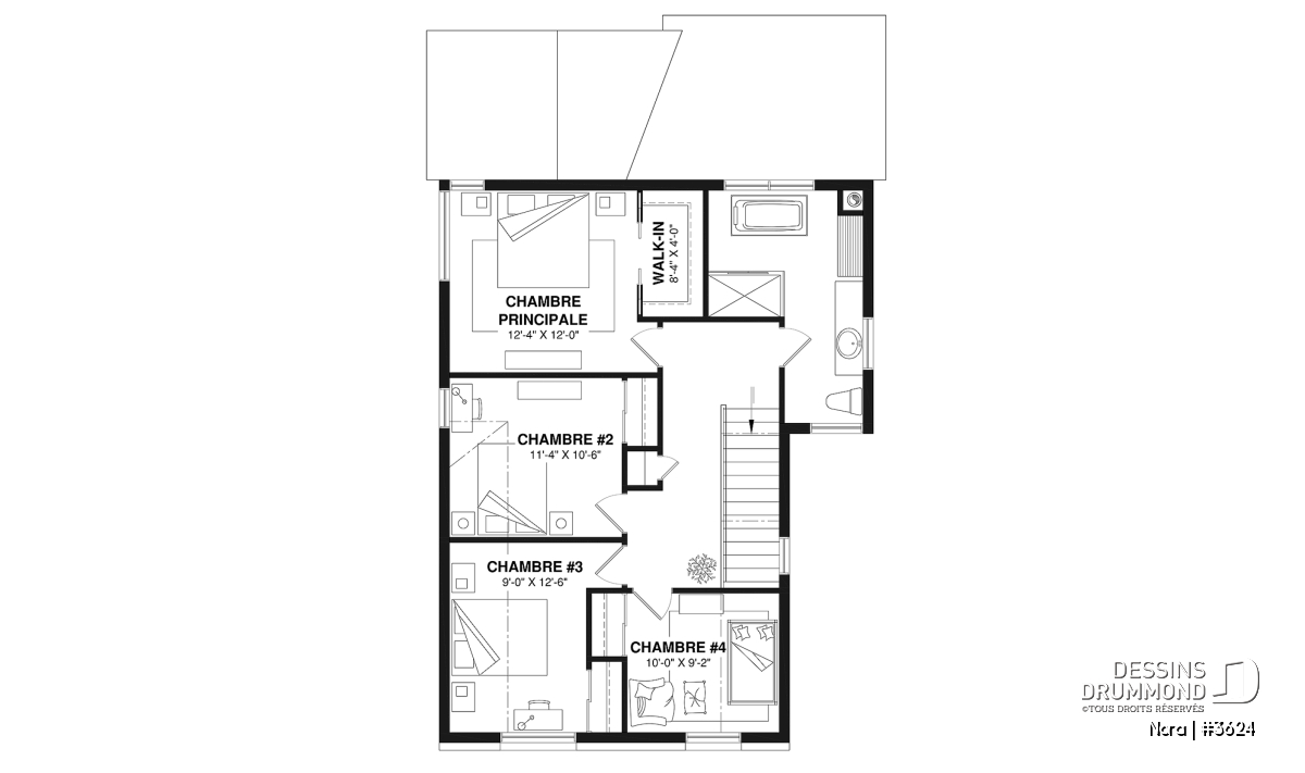 Trois chambres additionnelles à l’étage pour un total de quatre, ainsi qu’une salle de bain complète avec bain et douche séparés.
