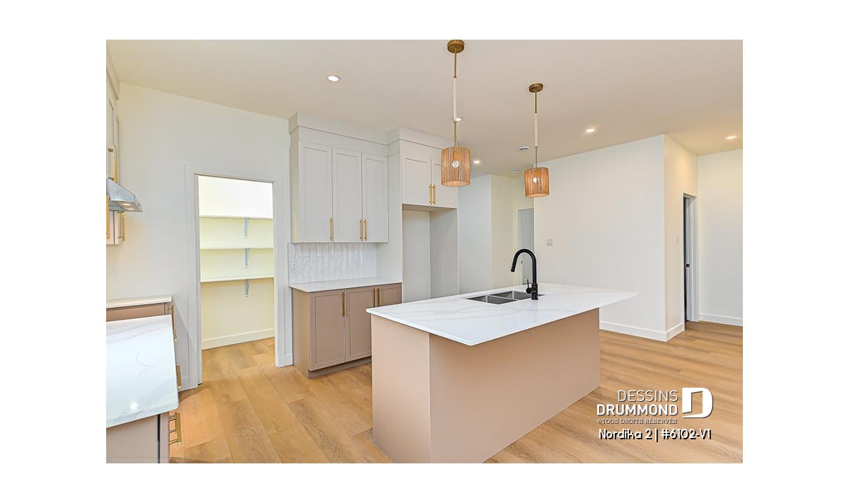 Cuisine fonctionnelle avec garde-manger et grand îlot central.