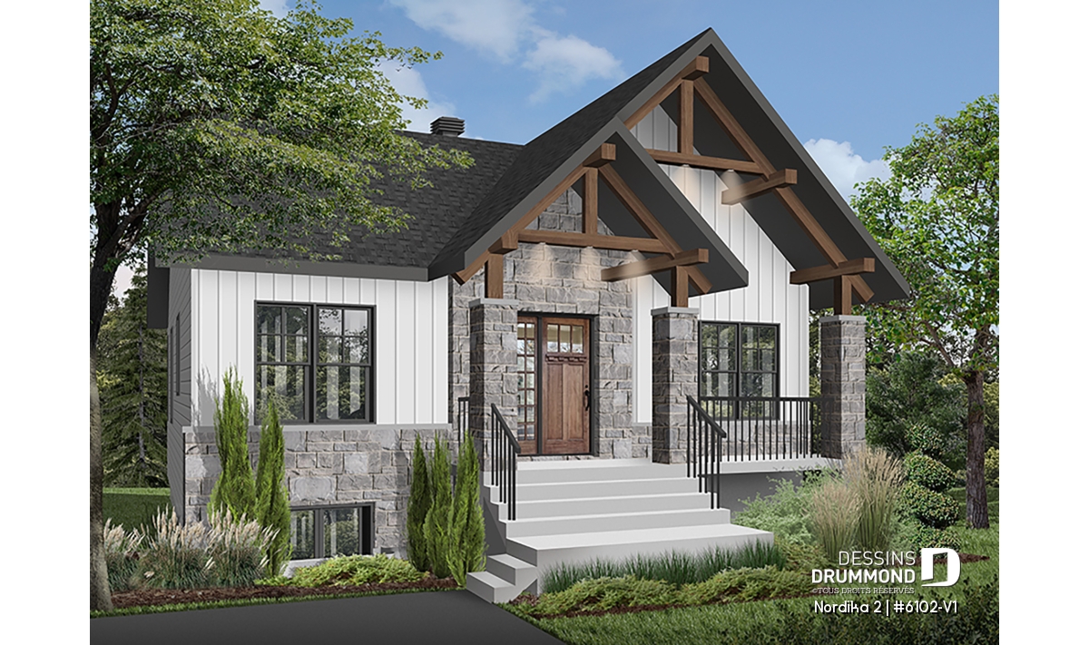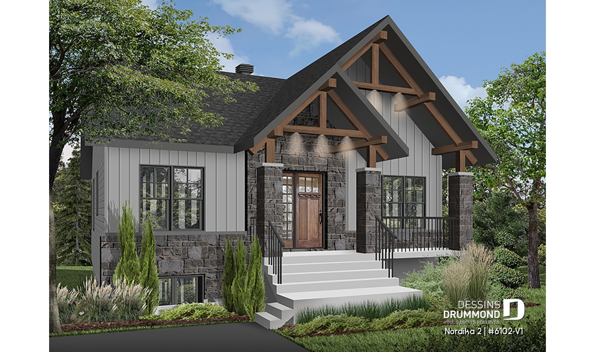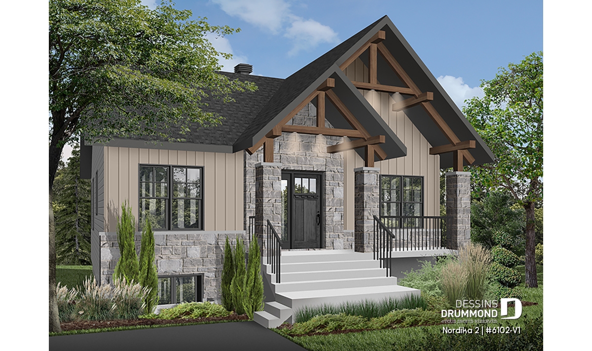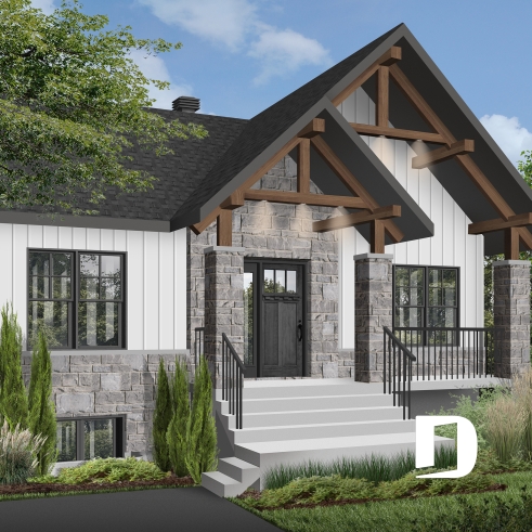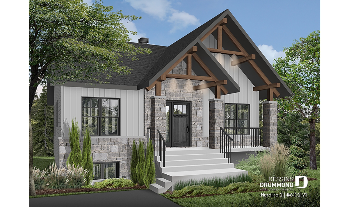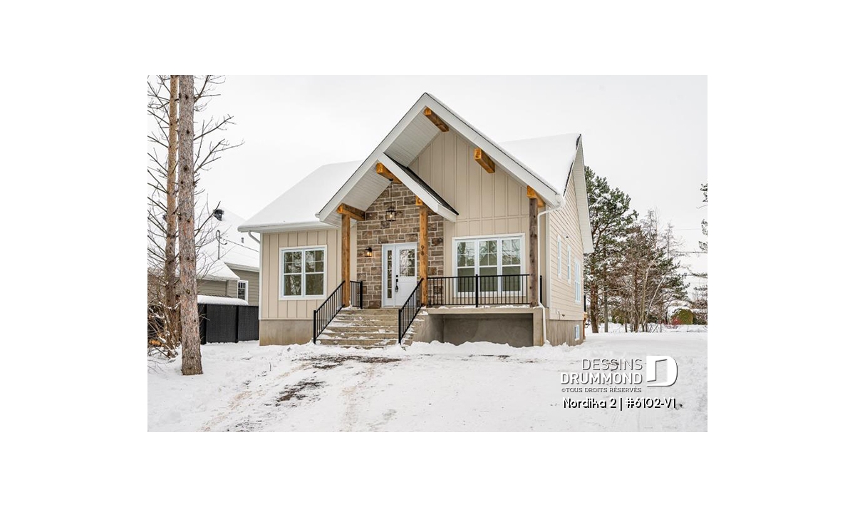 Le plan de maison NORDIKA 2 (6102-V1) surprend dès le premier regard. Avec son architecture rustique-moderne soigneusement pensée, cette demeure de 1 020 pi² réussit à allier charme, efficacité et polyvalence. Sa façade élégante, composée de 50 % de maçonnerie et de pignons de bois imposants, lui confère une présence noble et chaleureuse qui se poursuit à l’intérieur grâce aux magnifiques poutres de bois apparentes.