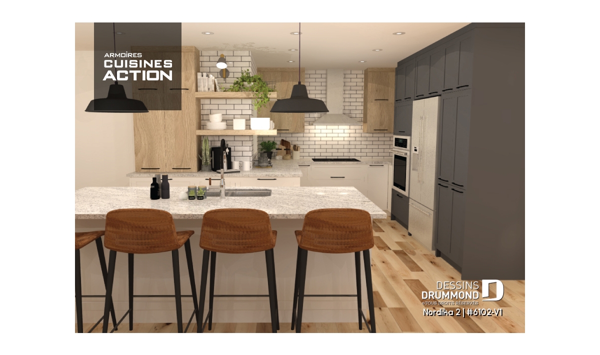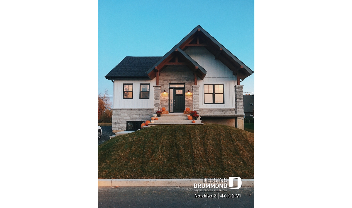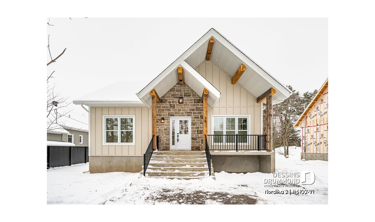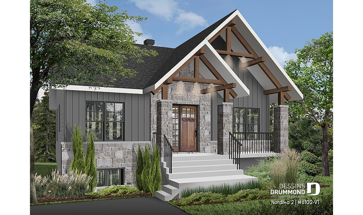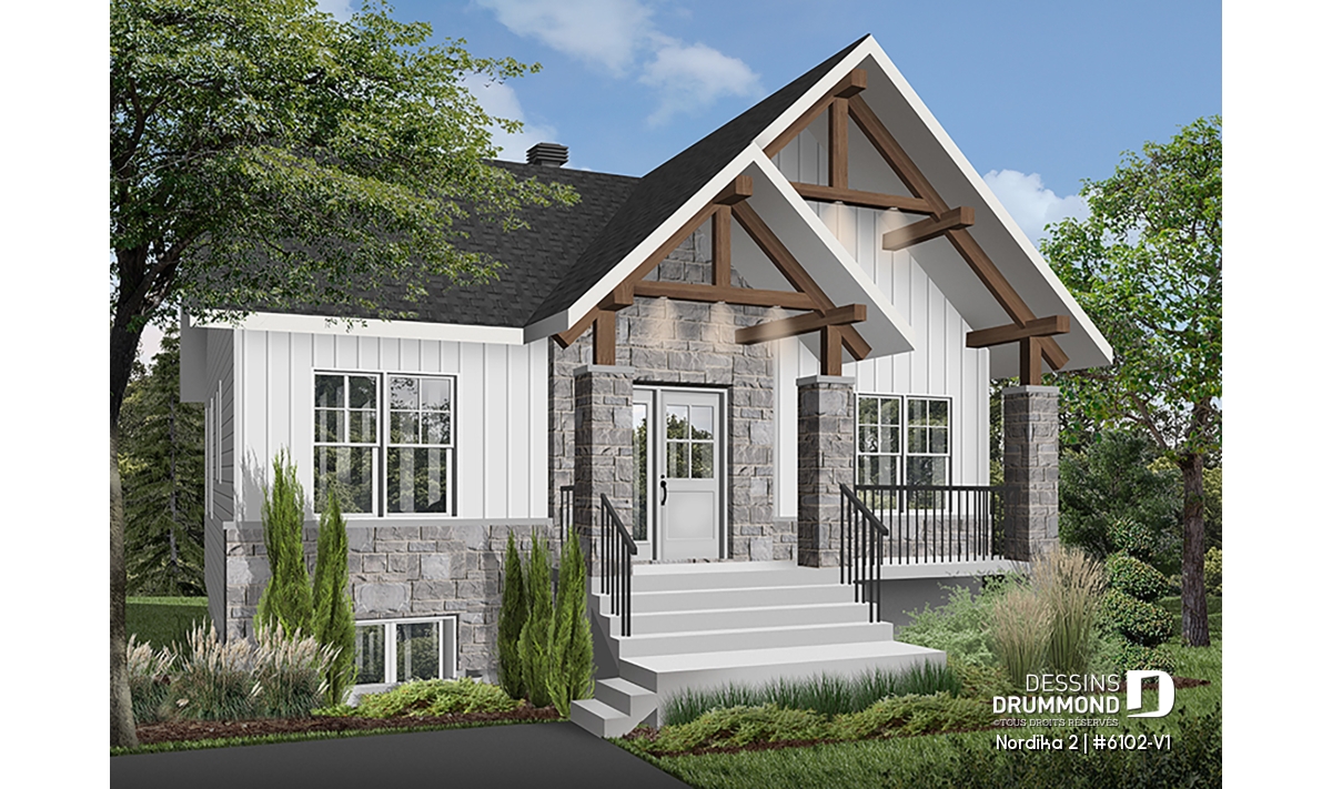 Le plan de maison NORDIKA 2 (6102-V1) surprend dès le premier regard. Avec son architecture rustique-moderne soigneusement pensée, cette demeure de 1 020 pi² réussit à allier charme, efficacité et polyvalence. Sa façade élégante, composée de 50 % de maçonnerie et de pignons de bois imposants, lui confère une présence noble et chaleureuse qui se poursuit à l’intérieur grâce aux magnifiques poutres de bois apparentes.
