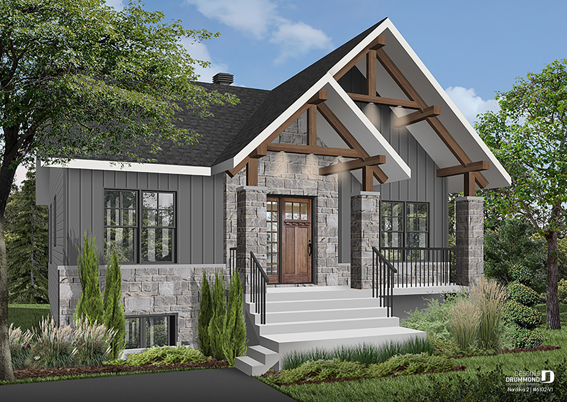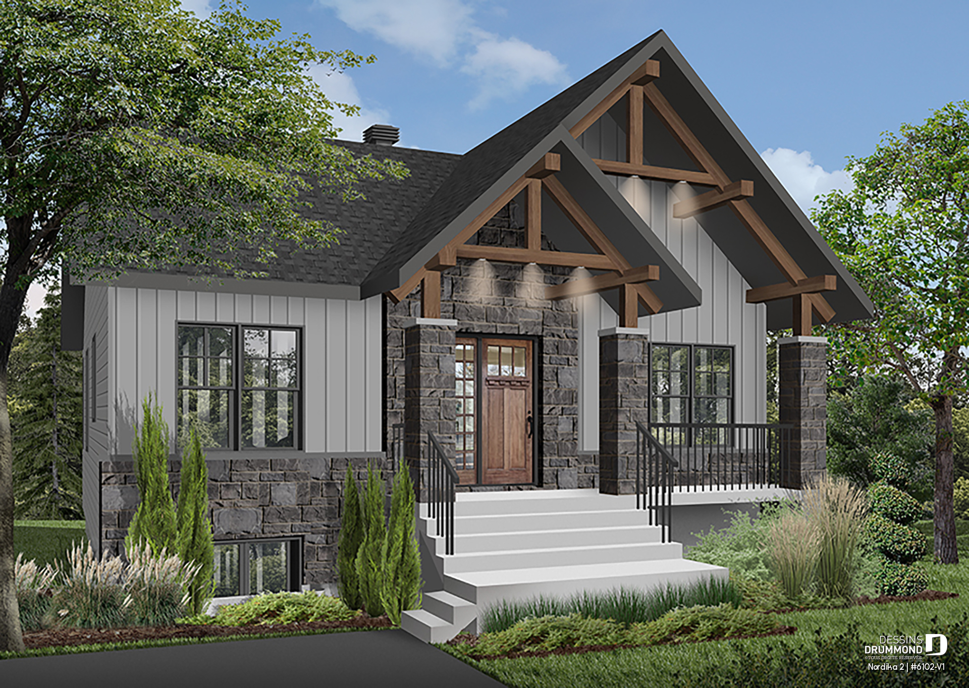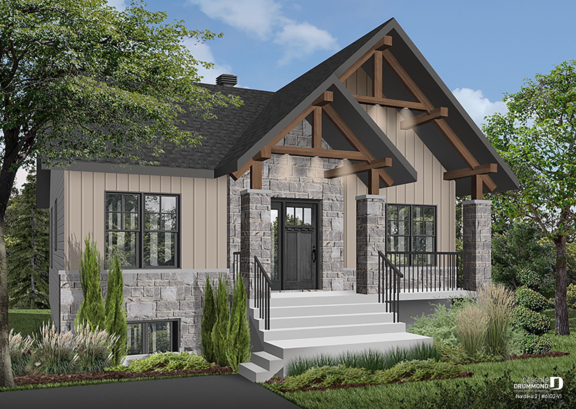 Le plan de maison NORDIKA 2 (6102-V1), reste surprenant et tendance autant à l’extérieur, qu’à l’intérieur. Cette maison de 1 020 pieds carrés, offre une prestigieuse apparence extérieure, avec une façade fait 50% de pierre et d’imposants pignons de bois. Le style rustique se continue jusqu’à l’intérieur, ou un rappel des pignons est fait avec de magnifiques poutres de bois au plafond.