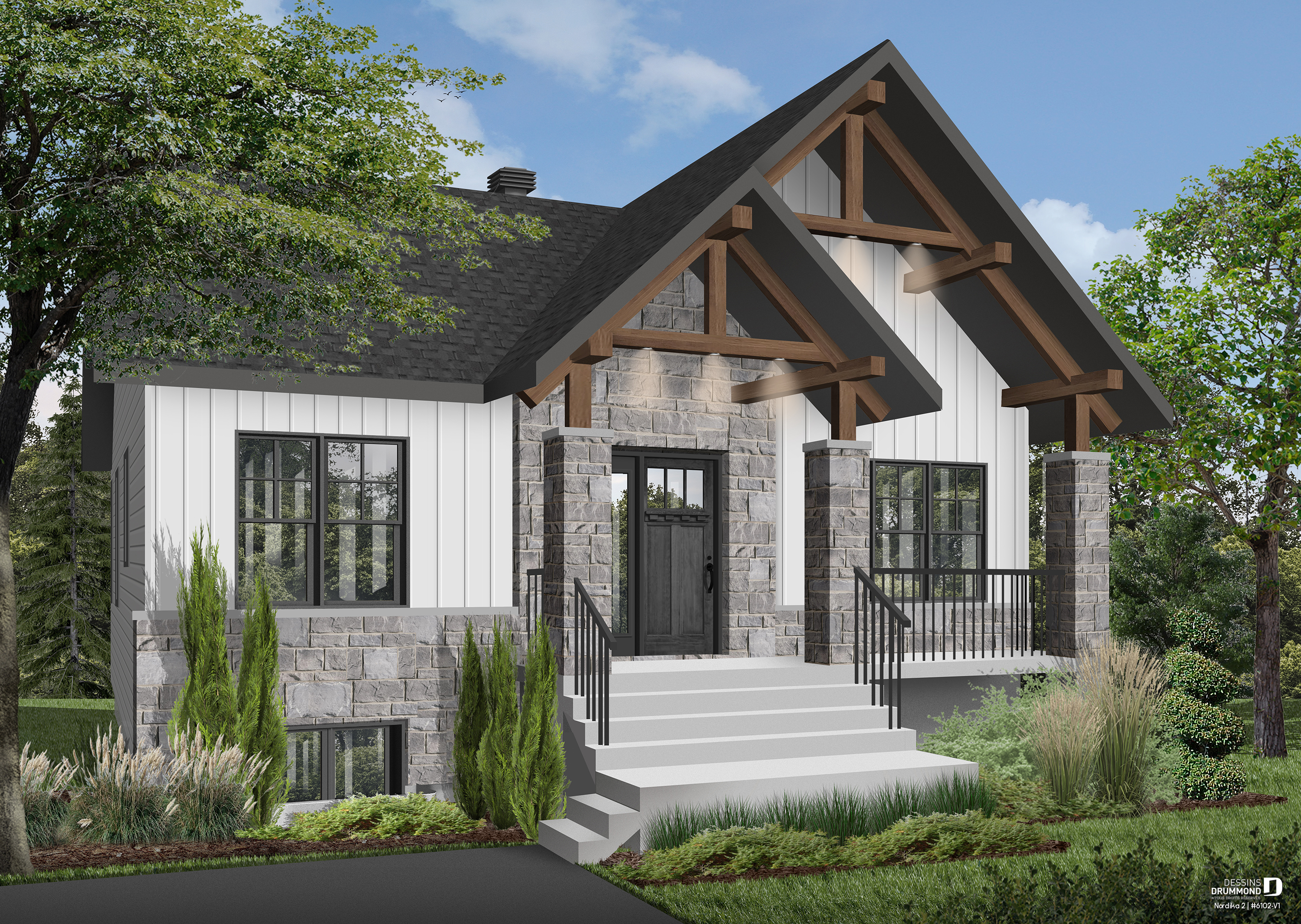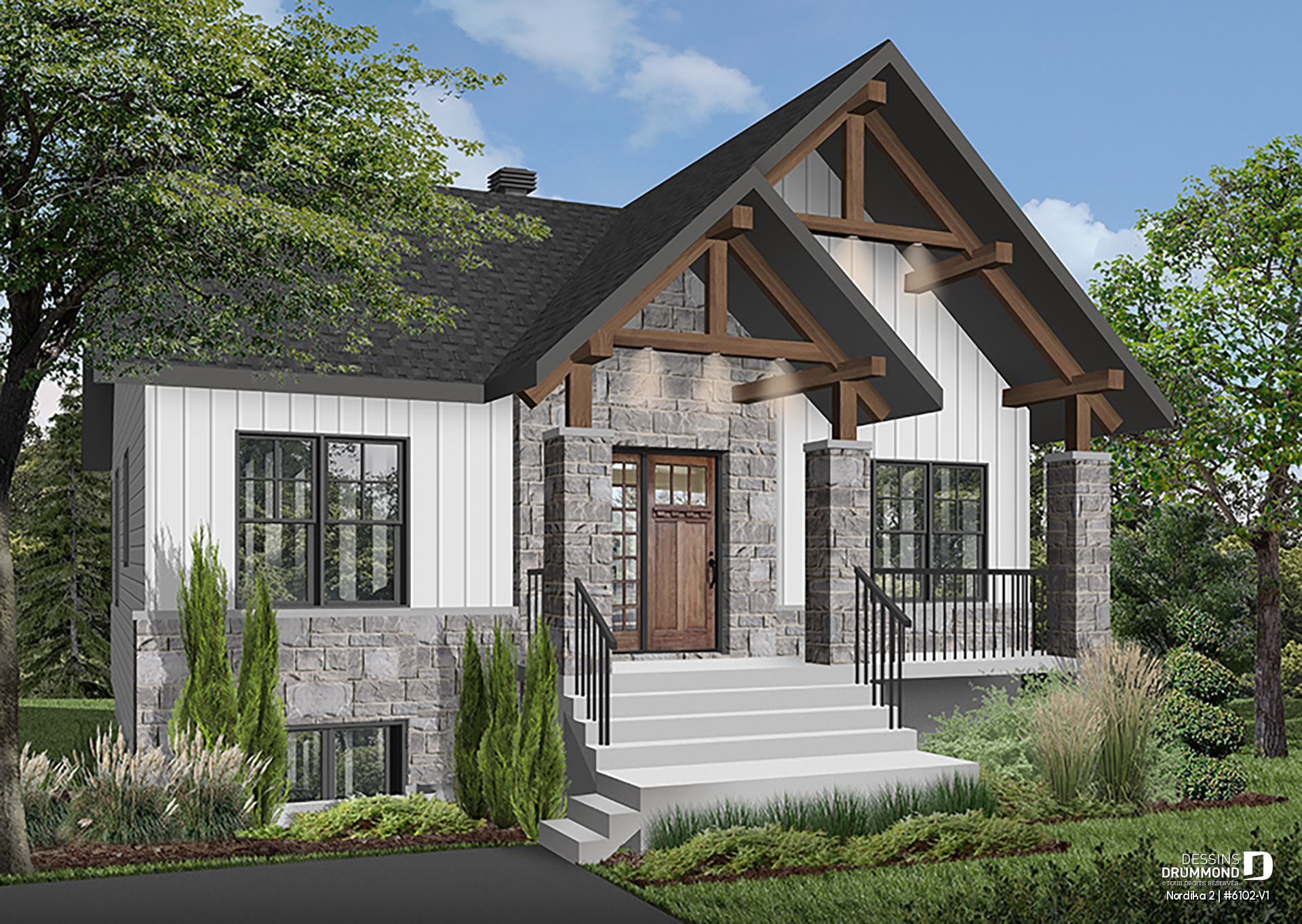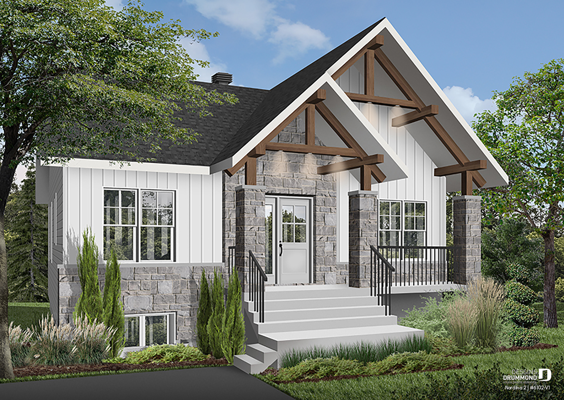Le plan de maison NORDIKA 2 (6102-V1), reste surprenant et tendance autant à l’extérieur, qu’à l’intérieur. Cette maison de 1 020 pieds carrés, offre une prestigieuse apparence extérieure, avec une façade fait 50% de pierre et d’imposants pignons de bois. Le style rustique se continue jusqu’à l’intérieur, ou un rappel des pignons est fait avec de magnifiques poutres de bois au plafond.