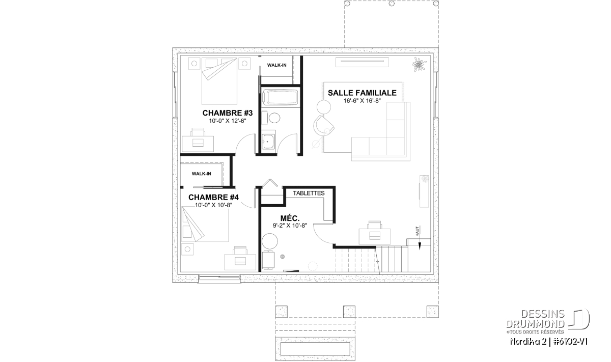 *Si vous souhaitez acheter le plan du sous-sol aménagé, tel que présenté sur la page de ce plan, veuillez sélectionner cette option dans le panier d'achat, dans la section "Sélectionner votre fondation". Si vous ne sélectionnez pas cette option, vous recevrez le sous-sol non fini, sans frais additionnel.