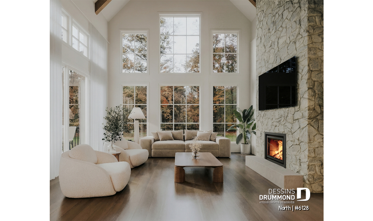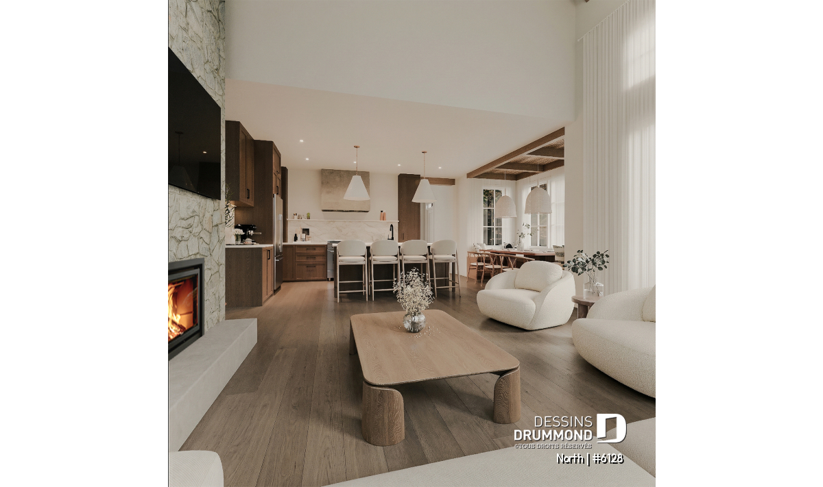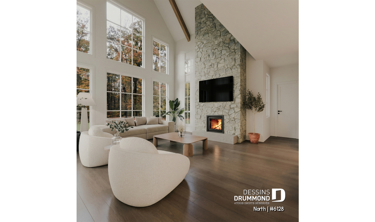 Le plan North (#6128) fait partie de la collection développée en collaboration avec STÛV, une référence en matière de foyers haut de gamme. Au cœur du salon, le foyer à bois STÛV s21 s’impose comme un véritable élément architectural. Plus qu’un simple point de chaleur, il devient une pièce maîtresse du design, apportant une ambiance chaleureuse et contemporaine à l’espace de vie. Son intégration a été soigneusement pensée pour maximiser à la fois le confort et l’esthétique, tout en créant un lieu de rassemblement naturel dans la maison.