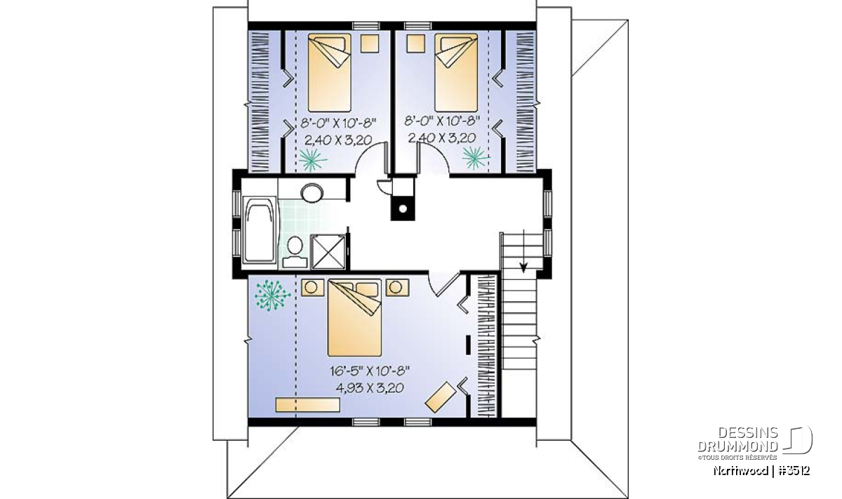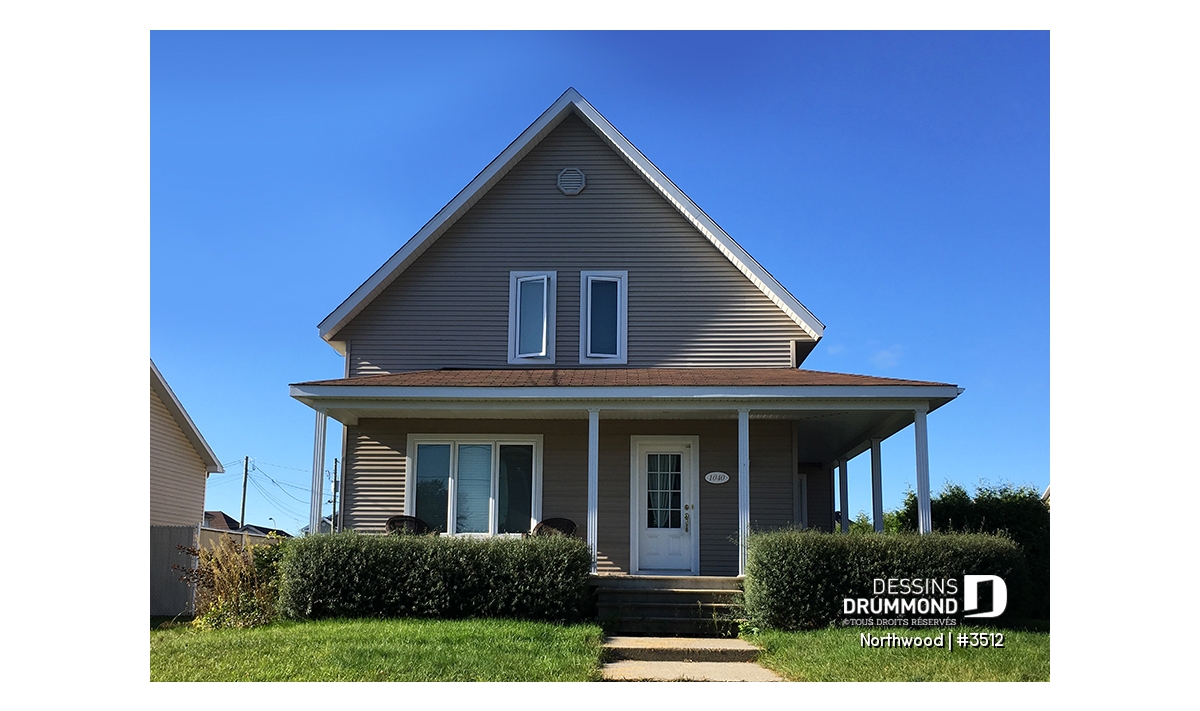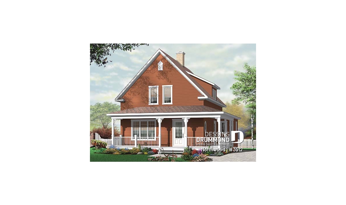 À l’intérieur, on apprécie un large rangement à l’entrée de service, une salle de séjour de belles dimensions avec foyer en coin, une salle à manger avec portes-jardin, une cuisine dégagée et un coin buanderie au rez-de-chaussée alors qu’à l’étage, on constate la présence d’une grande chambre des maîtres, d’une salle de bain située dans une lucarne identique à celle que l’on perçoit sur l’illustration extérieure et, de plus, de larges garde-robes à chacune des chambres pour encore plus de rangement.