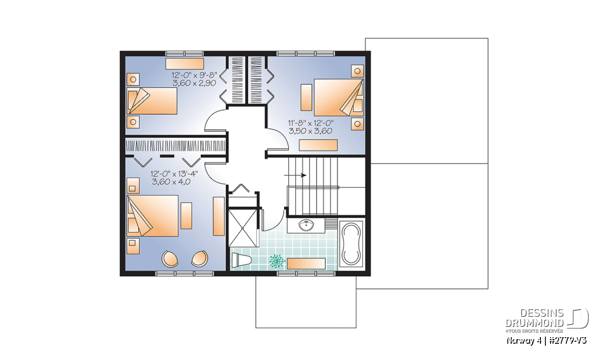 Trois chambres de bon format et salle de bain à l'étage, avec bain et douche de 40po. x 54po.