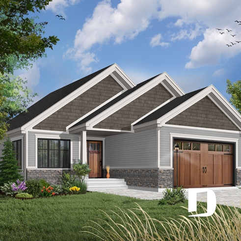 Maison de plain-pied tendance rustique avec garage, parfaite pour terrain étroit avec son 32 pieds en largeur.