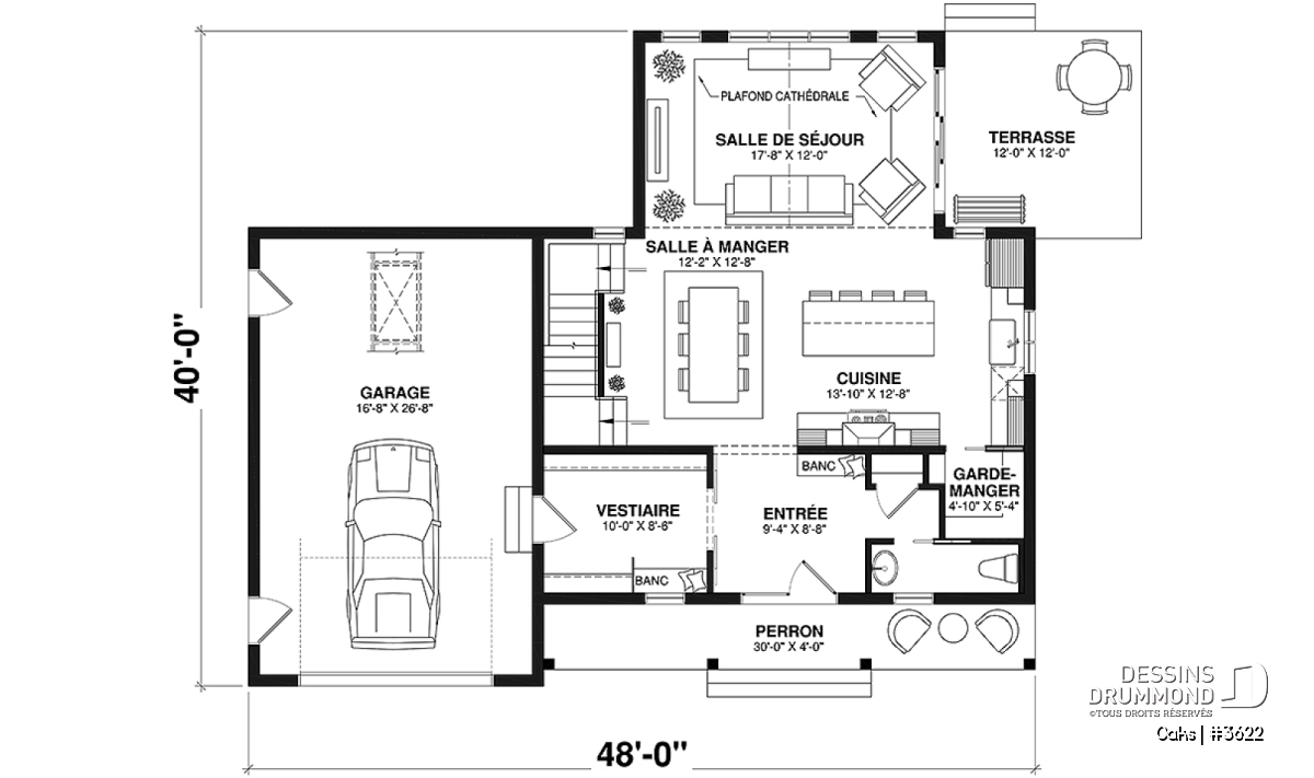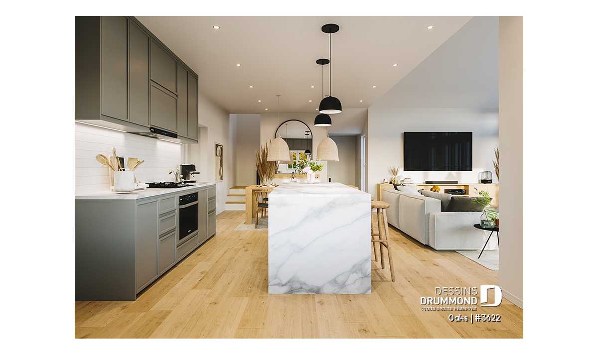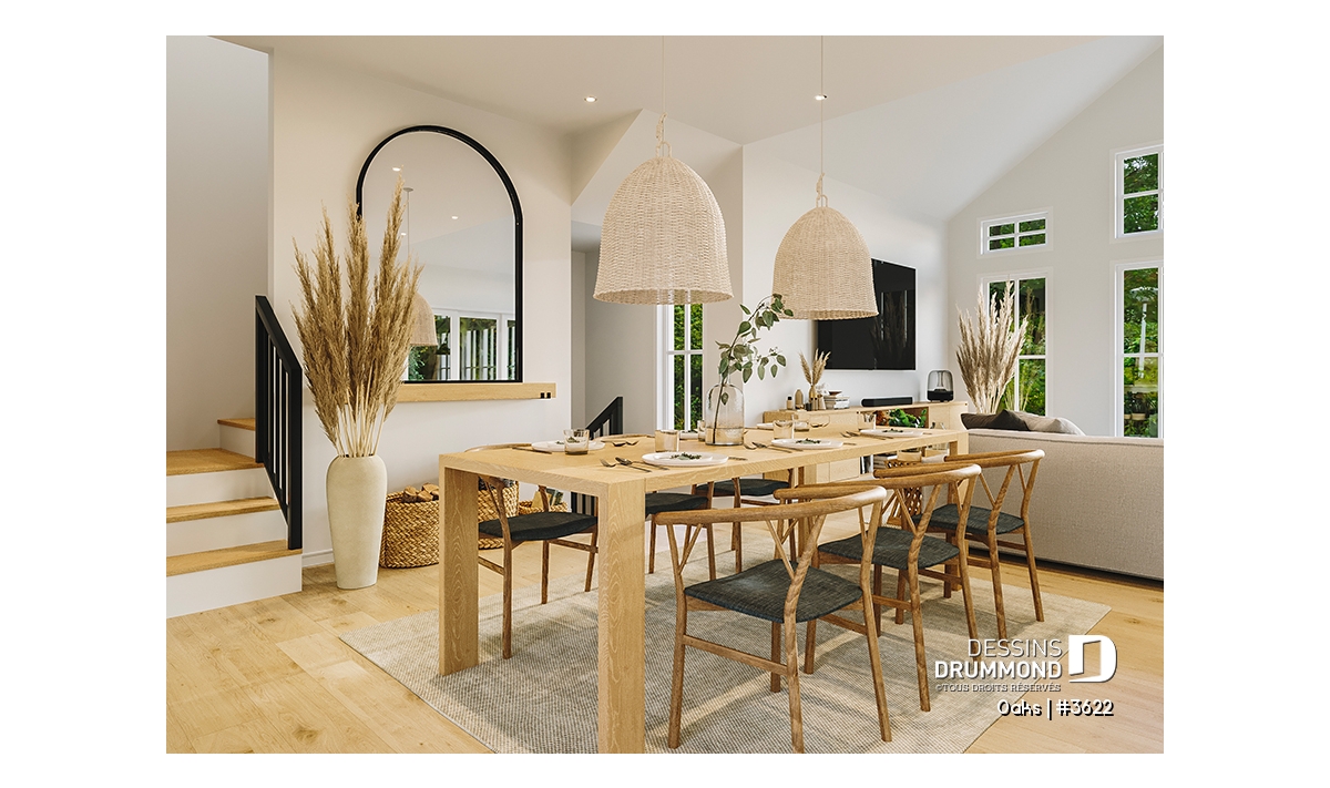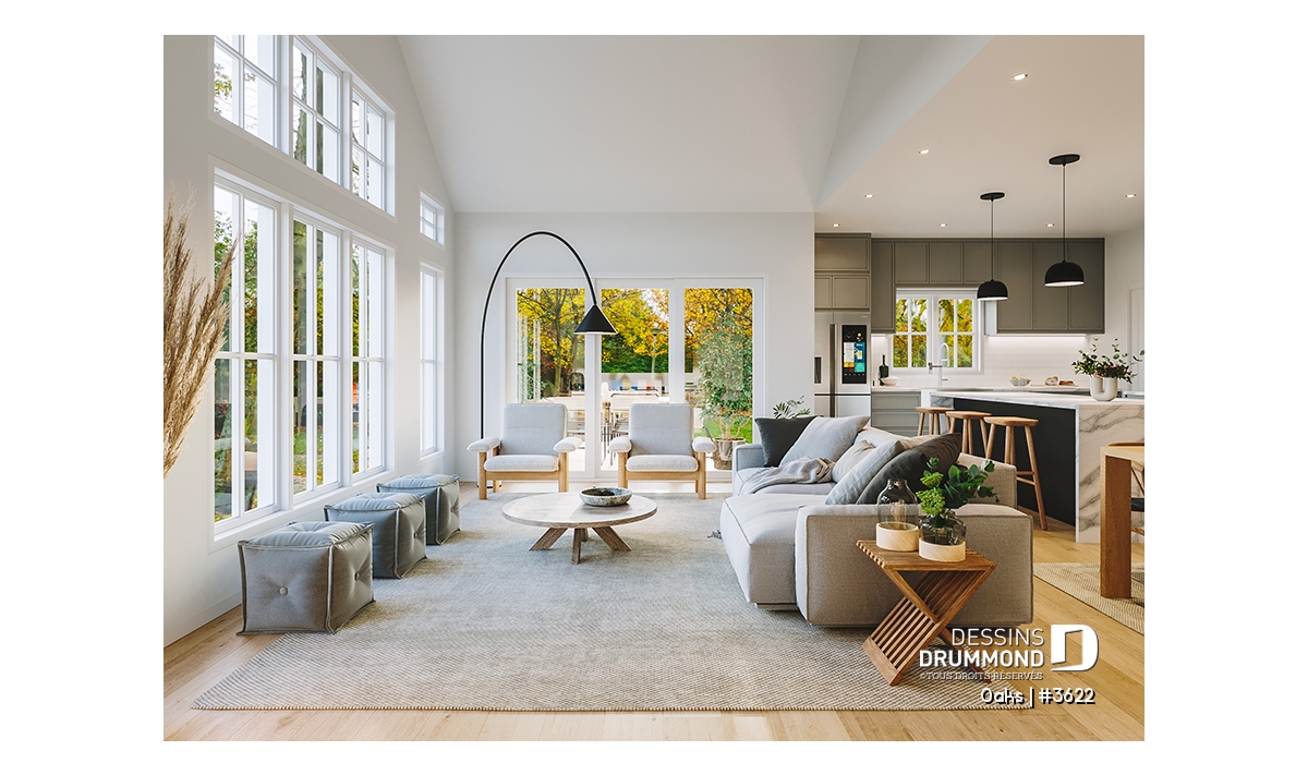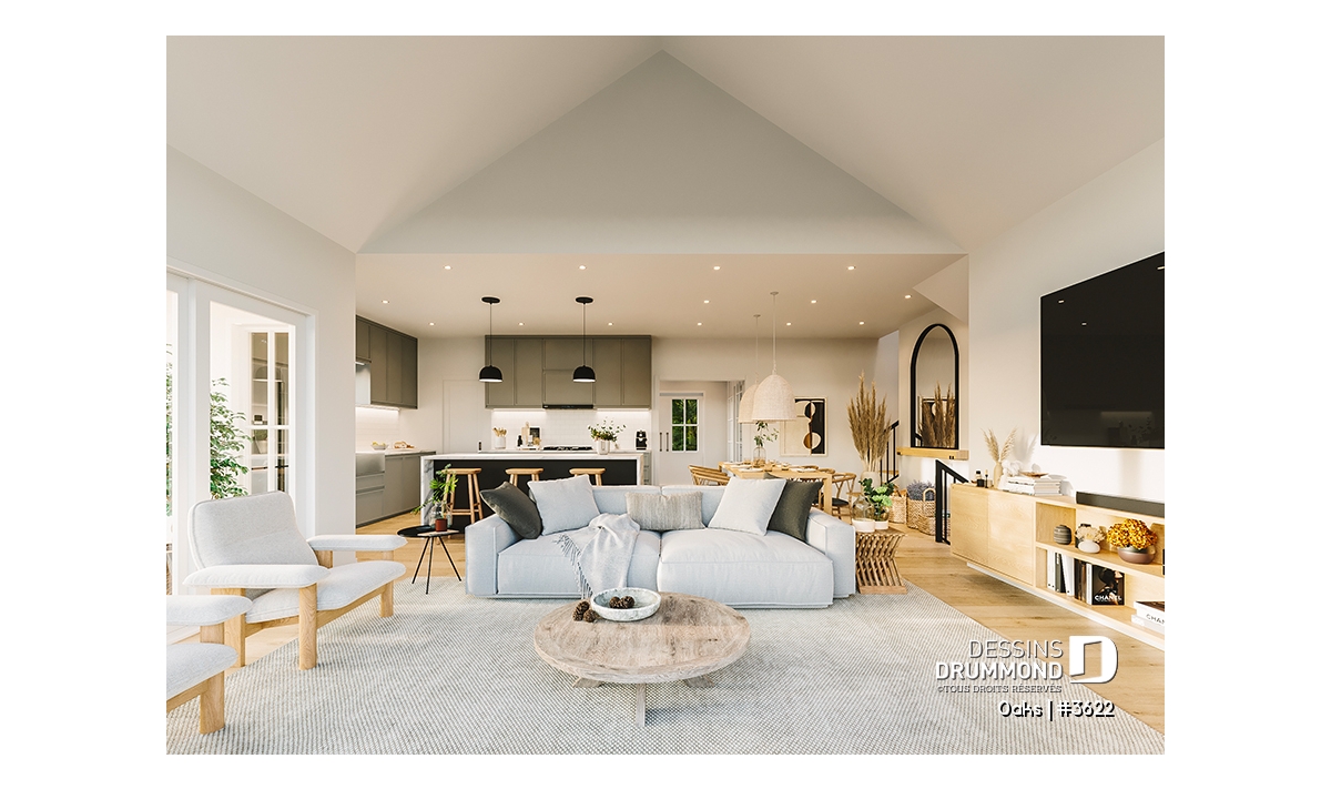 Le salon impressionne par son plafond cathédrale et sa fenestration abondante qui inonde la pièce de lumière naturelle. Cet espace ouvert sur la salle à manger et la cuisine devient le cœur convivial de la maison. La cuisine, à la fois élégante et fonctionnelle, propose un grand garde-manger et une disposition ouverte favorisant les échanges lors des repas ou des réceptions.