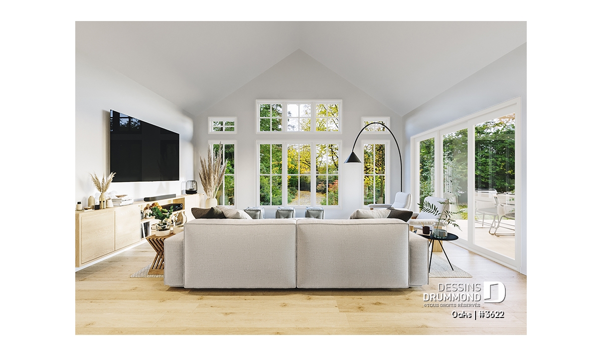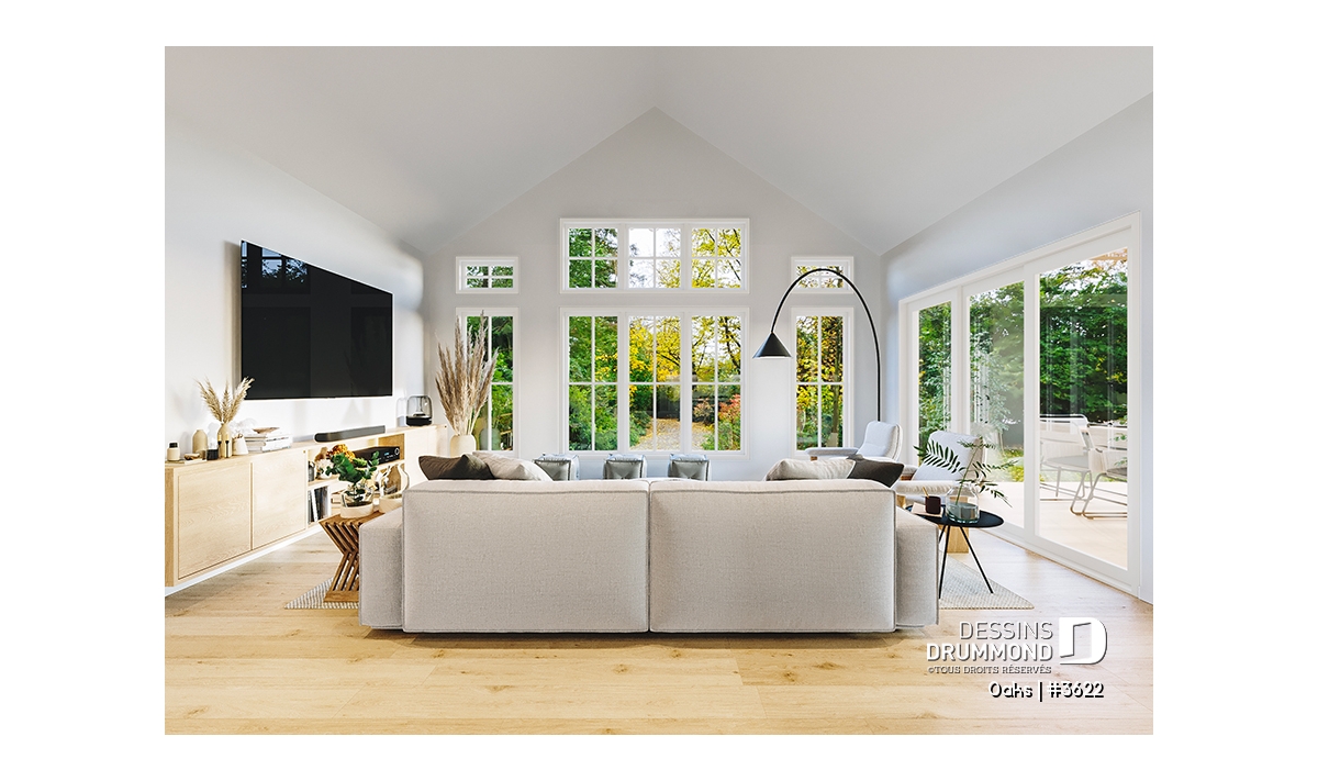 Salon lumineux avec plafond cathédrale et fenestration généreuse offrant une superbe clarté naturelle.