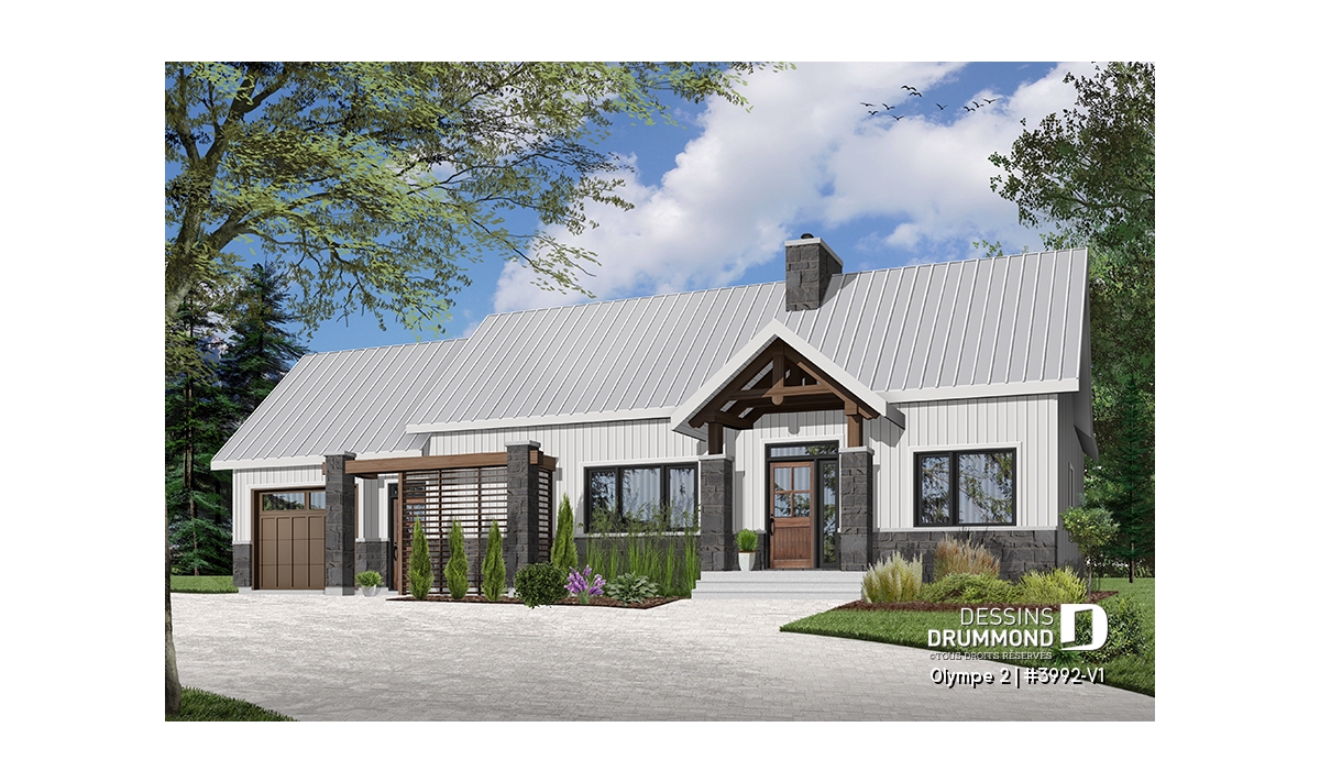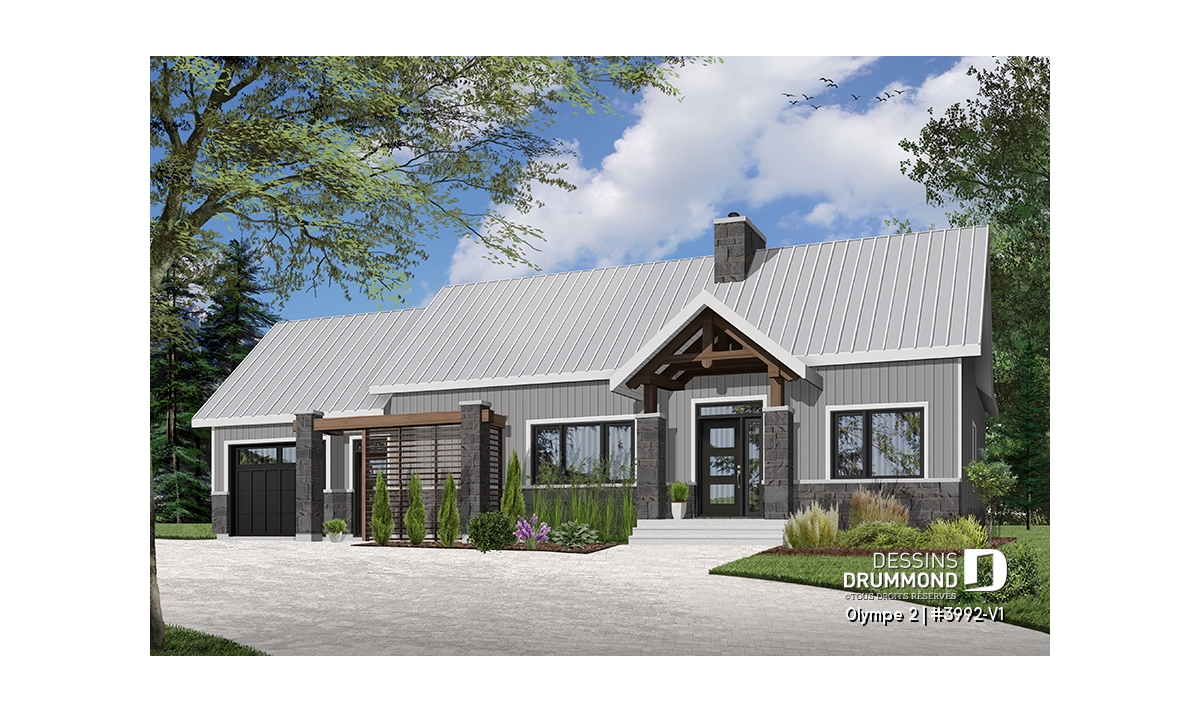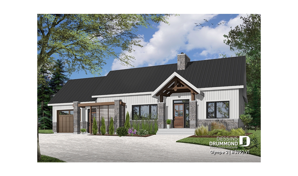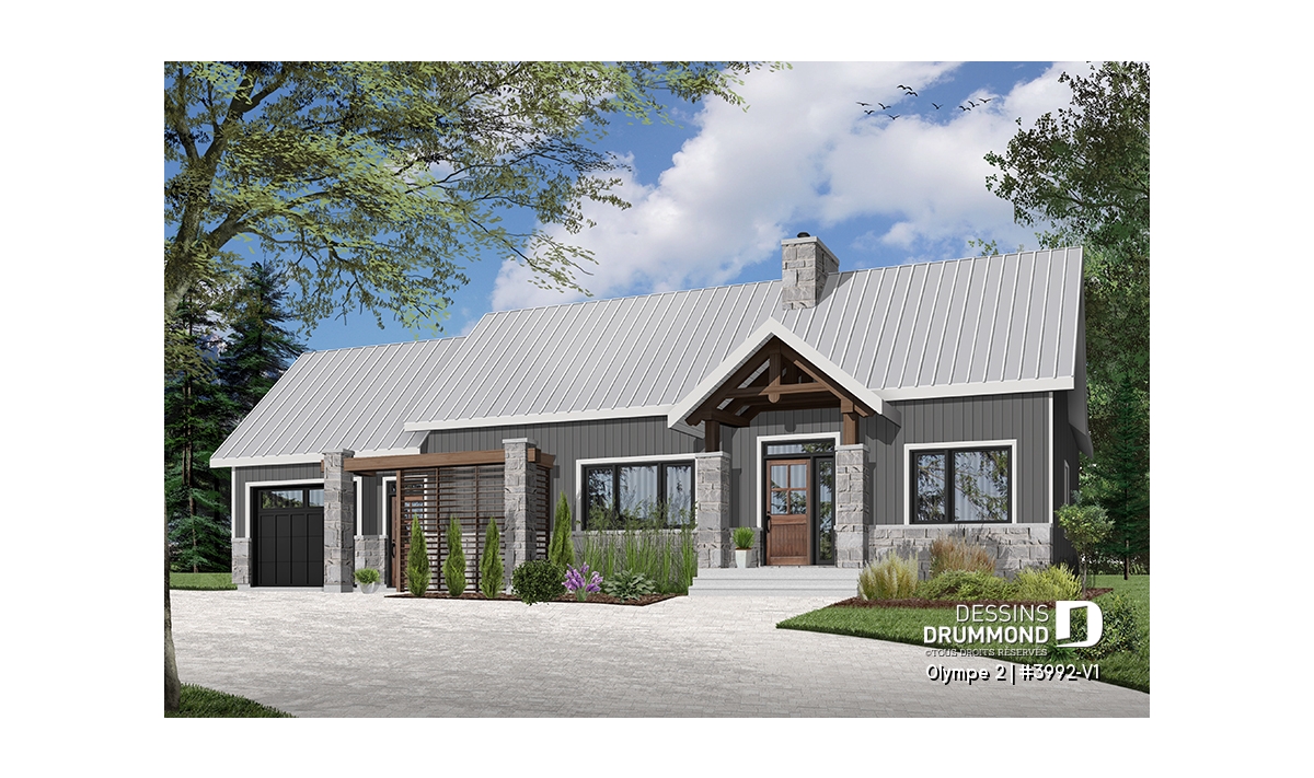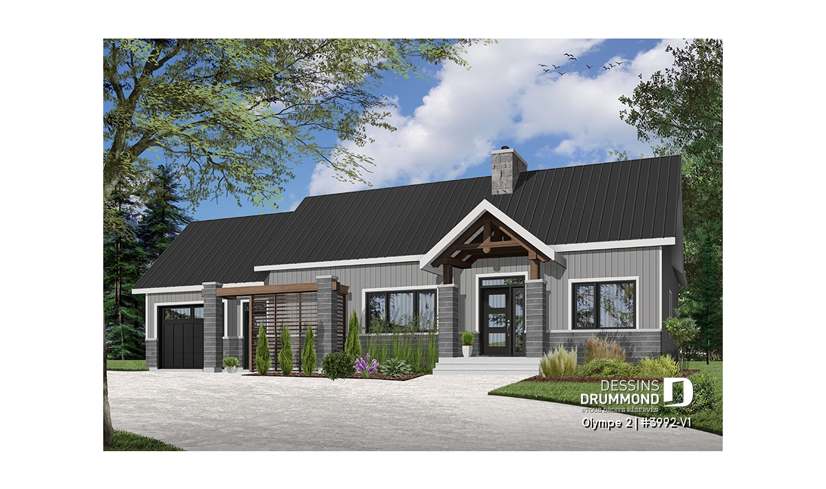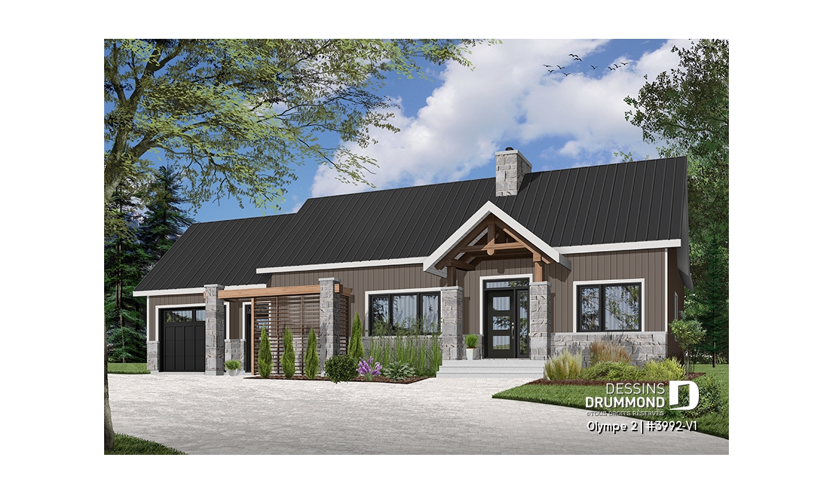 Qu’il soit situé aux abords d’un lac ou aux pieds d’un mont de ski, le nouveau plan de maison Olympe 2 (plan # 3992-V1), qui se veut être la version avec garage de notre plan # 3992, rappelle ce chalet tant aimé où il fait bon entrer!