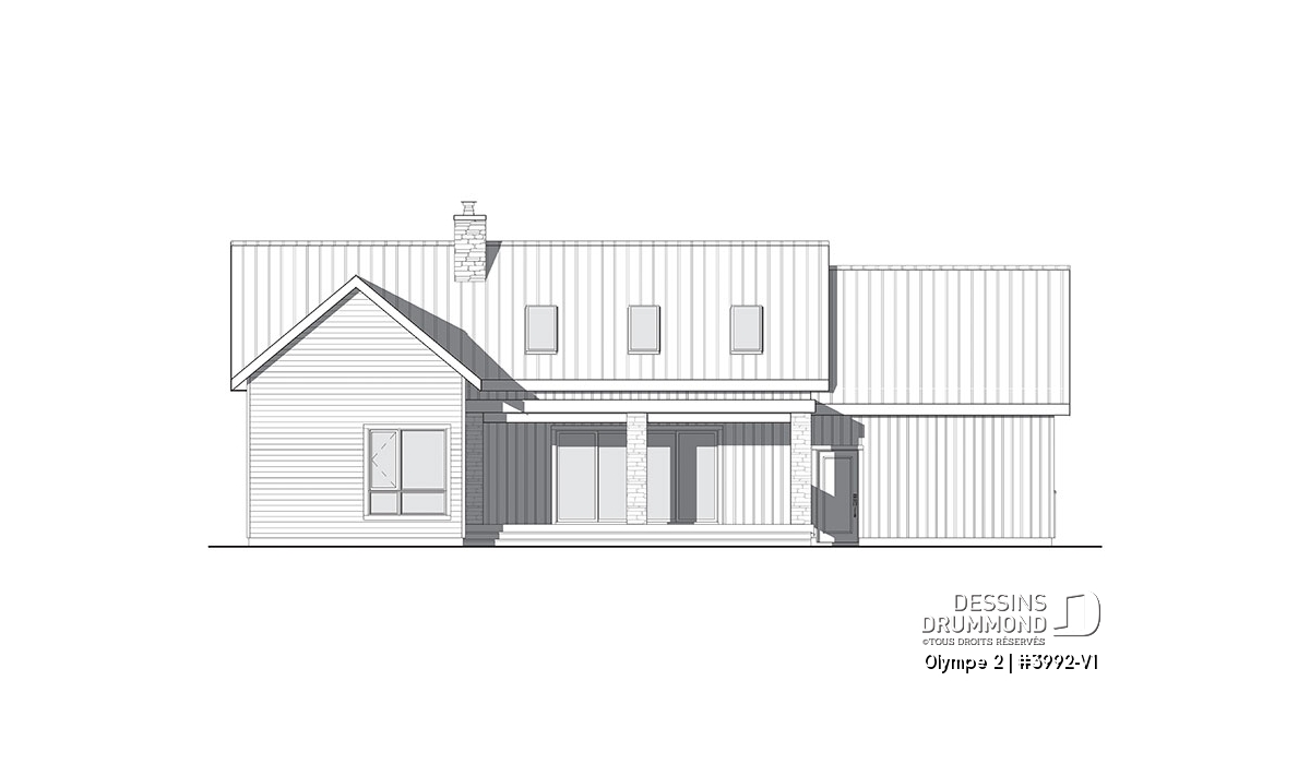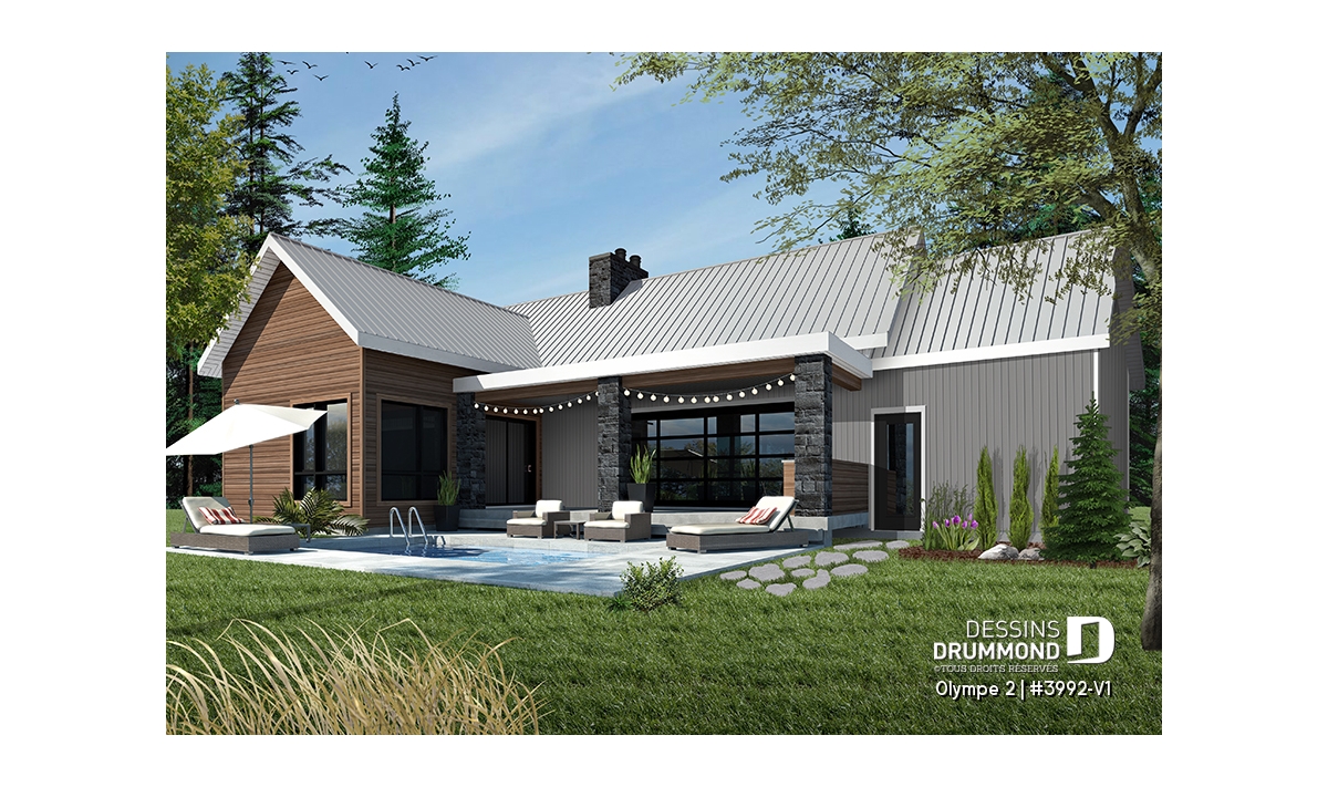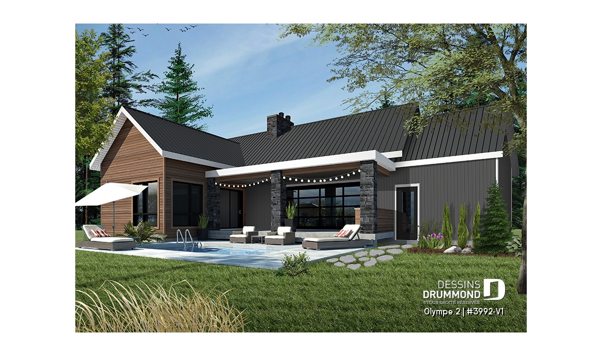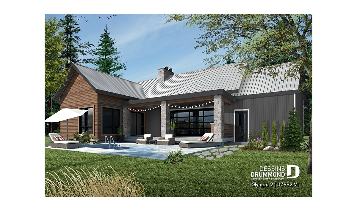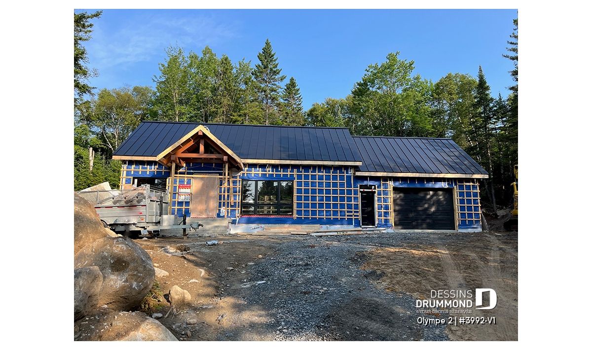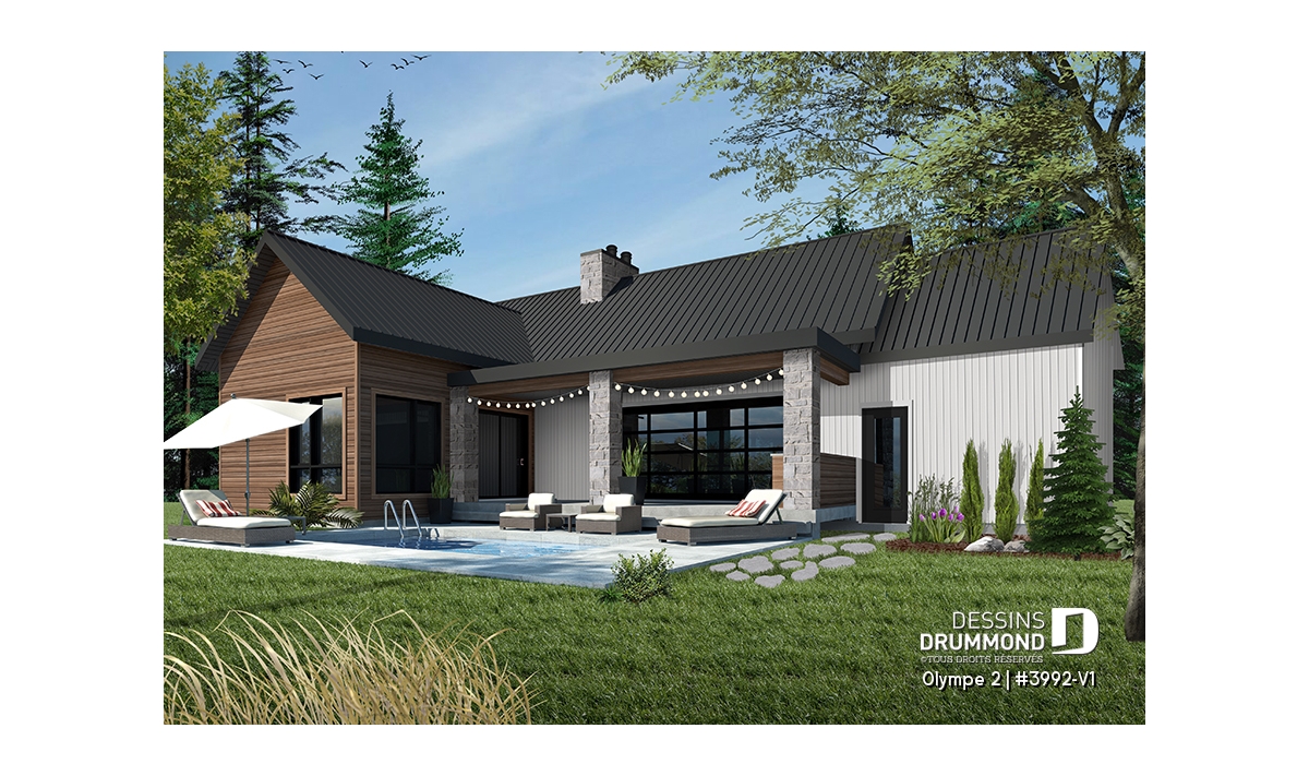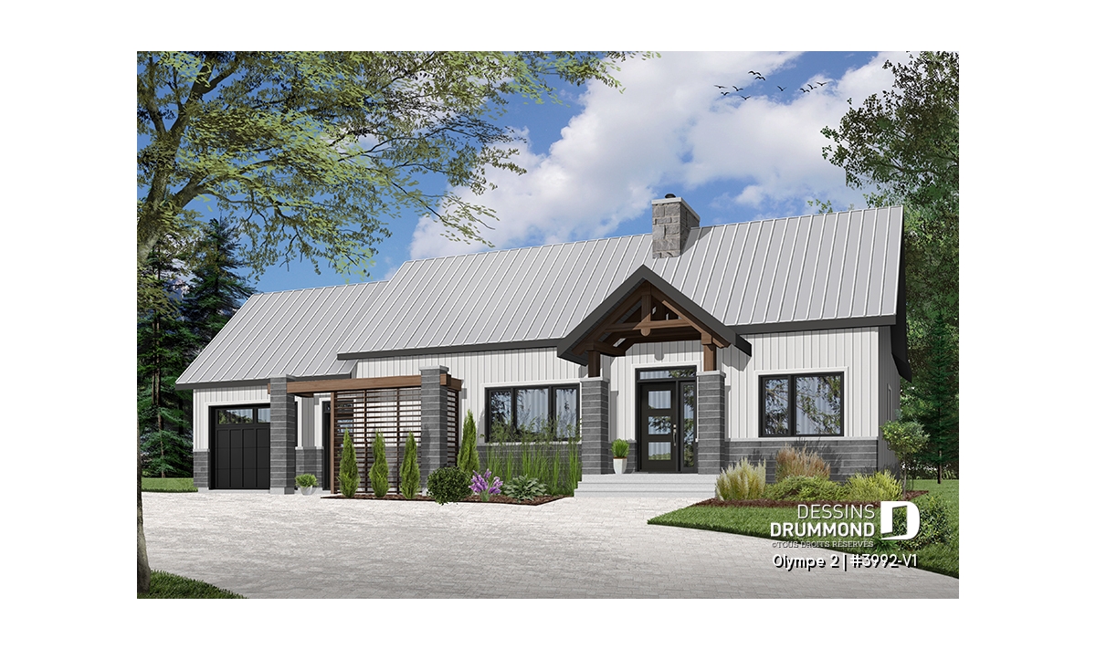 Qu’il soit situé aux abords d’un lac ou aux pieds d’un mont de ski, le nouveau plan de maison Olympe 2 (plan # 3992-V1), qui se veut être la version avec garage de notre plan # 3992, rappelle ce chalet tant aimé où il fait bon entrer!
