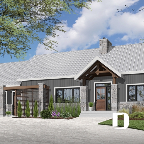 Tout à fait chaleureux et se distinguant avec brio des autres de style plain-pied, ce modèle de maison avec porte patio triple à la salle familiale vous surprendra assurément. D'inspiration du style scandinave, il rassemble à lui seul tous les éléments qui contribuent à en faire un modèle parfait pour les amoureux de la nature. Attendez de voir l’intérieur!