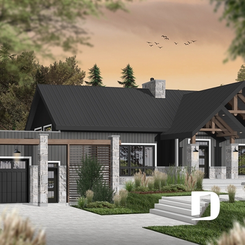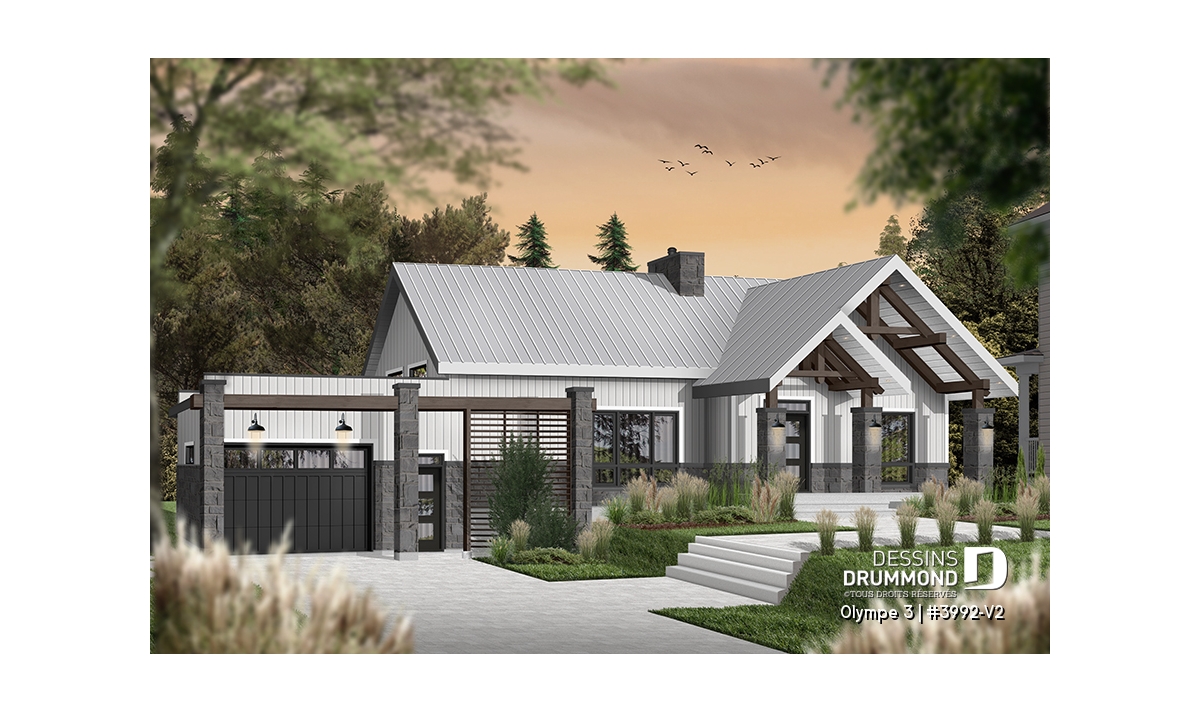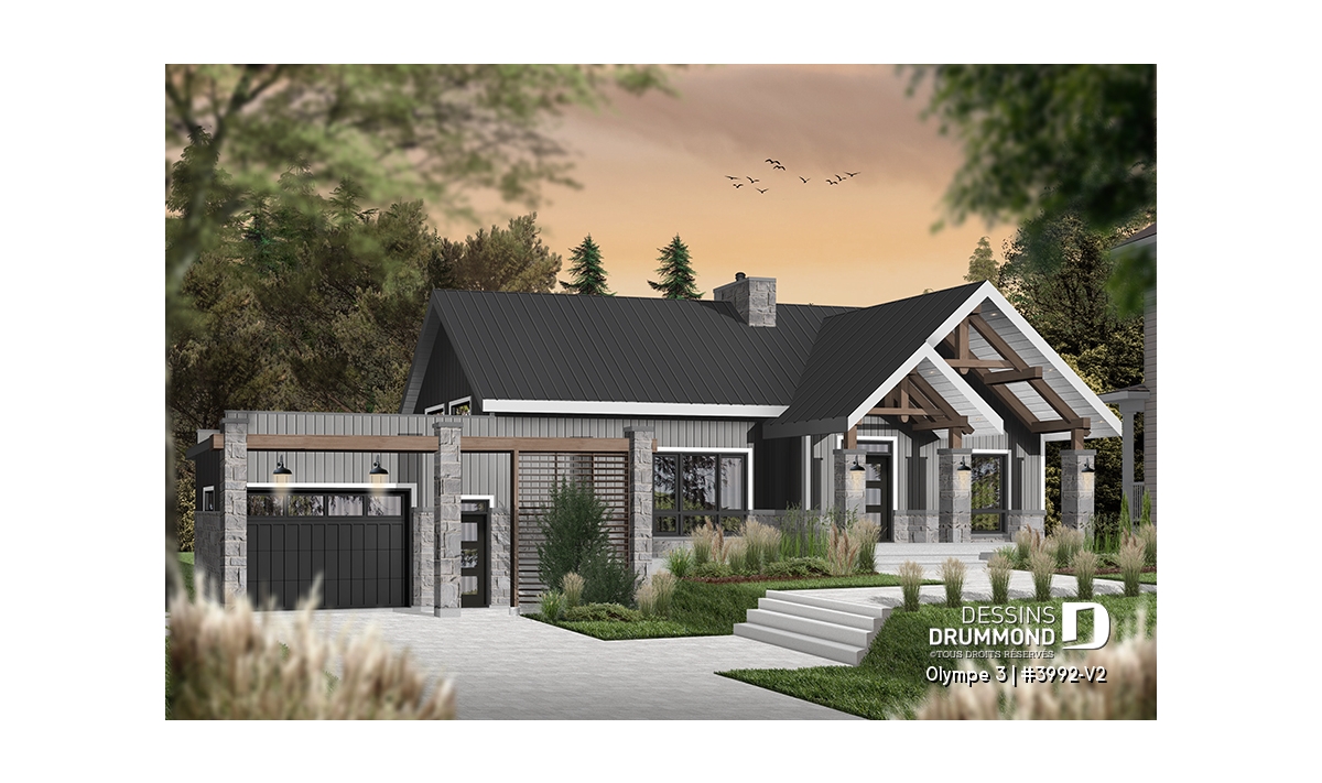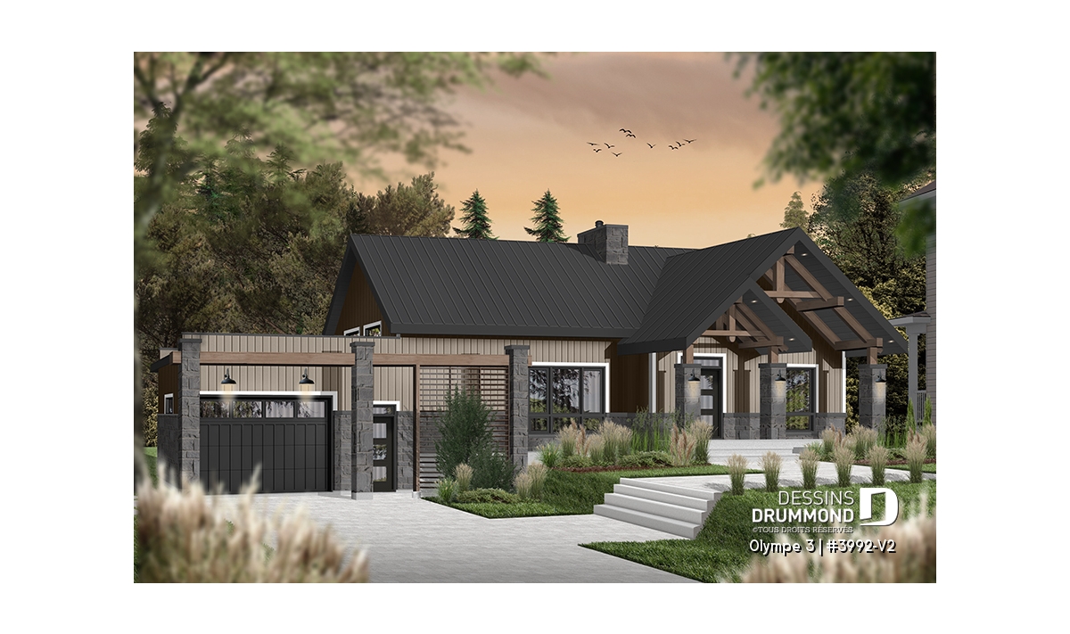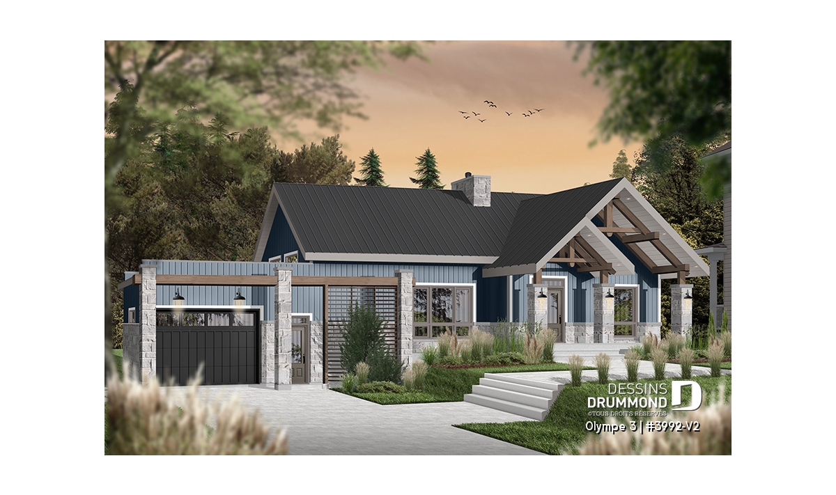 Un autre magnifique modèle parfait pour les abords d’un lac ou aux pieds d’un mont de ski, le nouveau plan de maison Olympe 3 (plan # 3992-V2), qui se veut être la version avec garage de notre plan # 3992, et possédant 3 chambres plutôt que 2 comme sur son modèle de base, rappelle ce chalet tant aimé où il fait bon entrer!