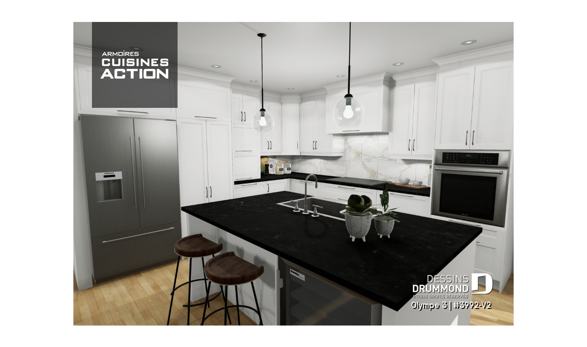 Plan # 3992-V2 : modèle agrandie à 1604 pieds carrés, avec garage, 3 chambres, buanderie au rez-de-chaussée.
