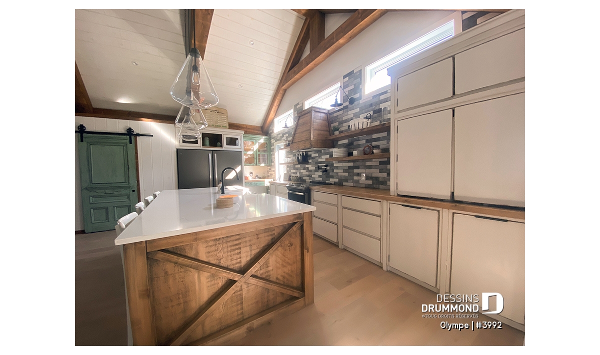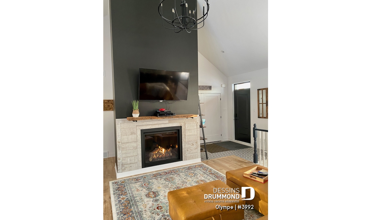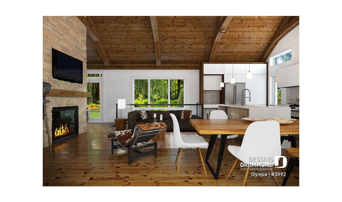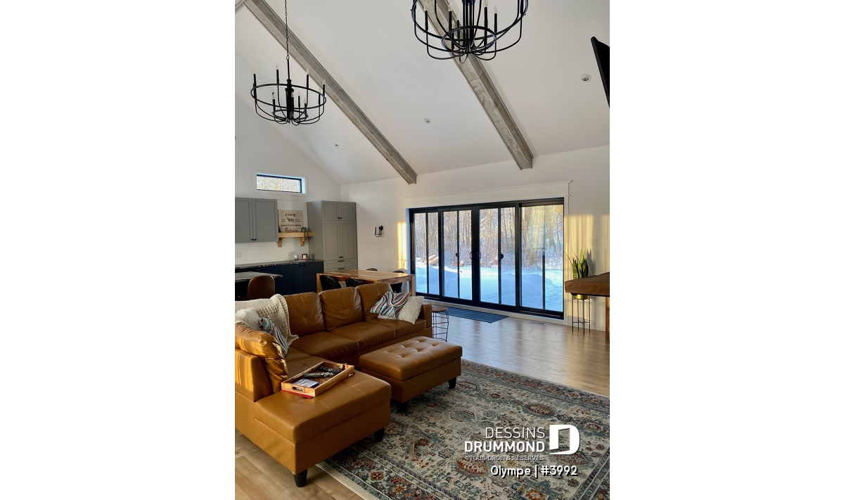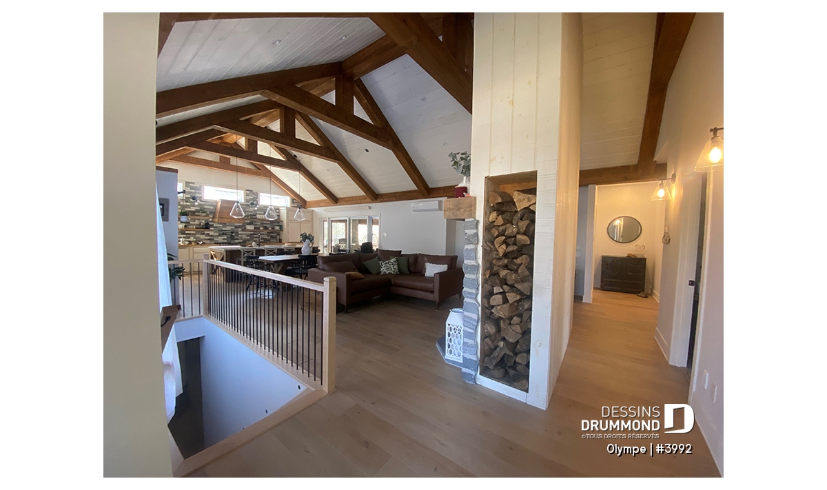 Sous-sol aménagé - Plan de maison scandinave moderne, plafond cathédrale avec poutres de bois, cuisine extérieure abritée, foyer - Olympe