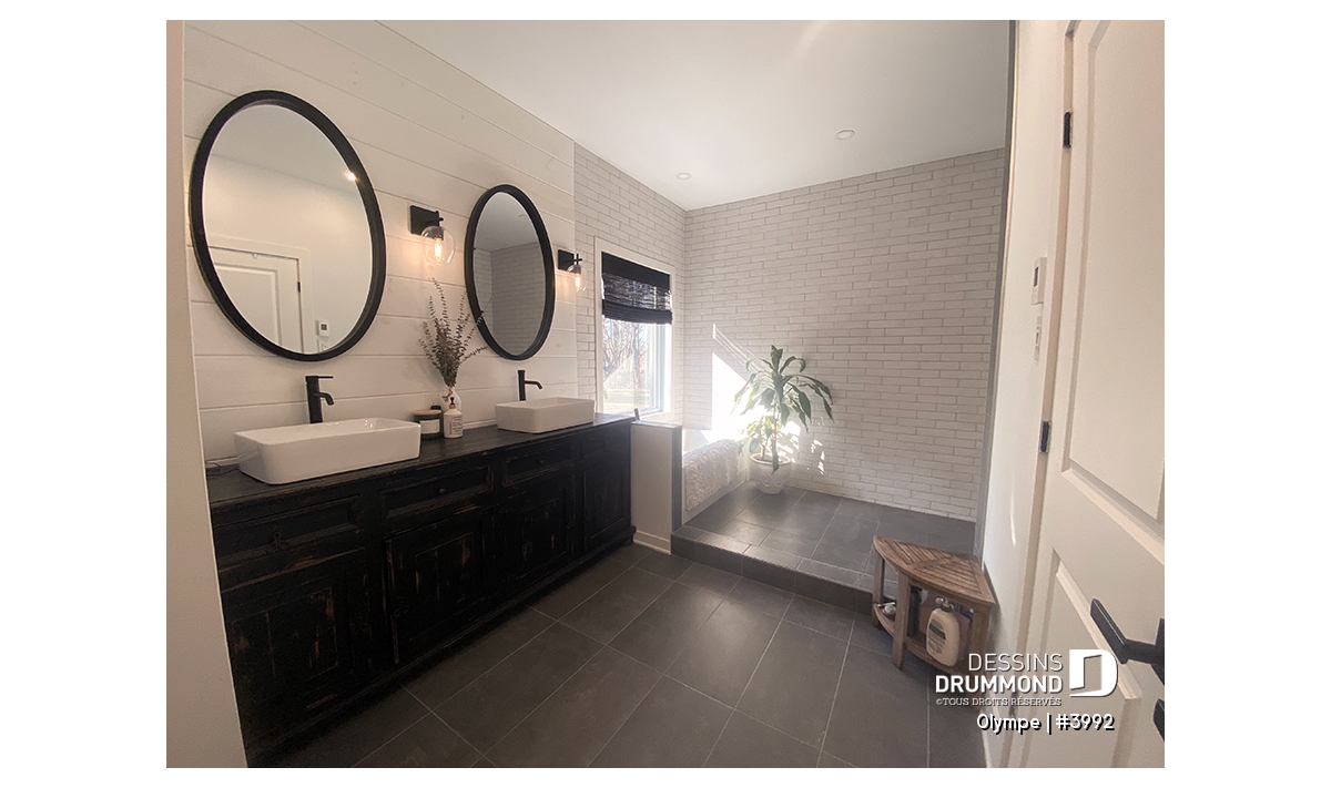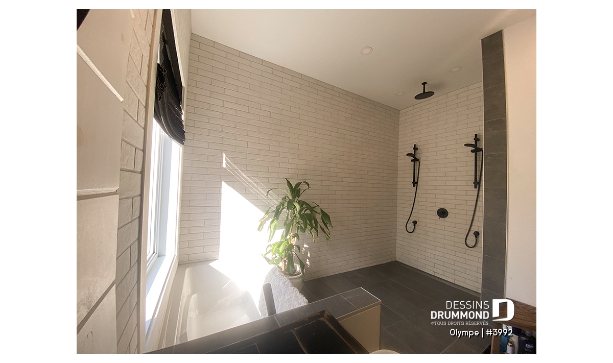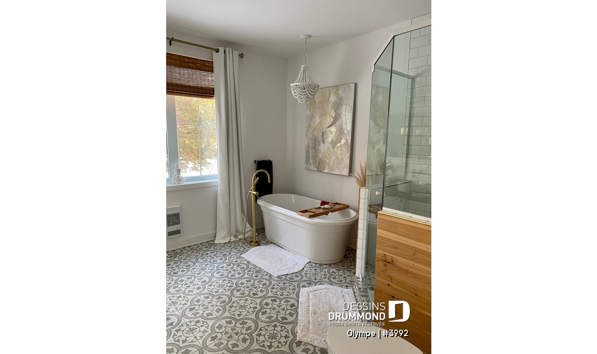 La chambre principale, véritable cocon, profite d’un accès privé à la terrasse et communique directement avec une salle de bain complète, élégante et pratique, incluant douche séparée et baignoire. Avec son foyer central au salon pour les soirées d’hiver et sa terrasse couverte pour les beaux jours, le plan OLYMPE réunit tout ce qu’il faut pour une vie confortable et inspirante.