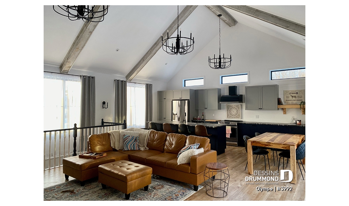 Plafond cathédrale d’environ 16' au séjour, à la cuisine et à la salle à manger, avec poutres apparentes pour une touche nordique chaleureuse.