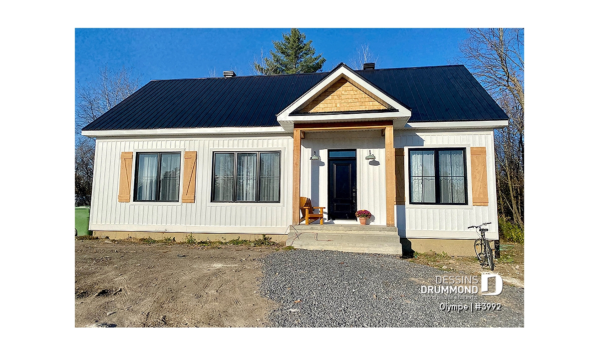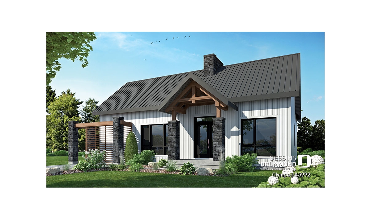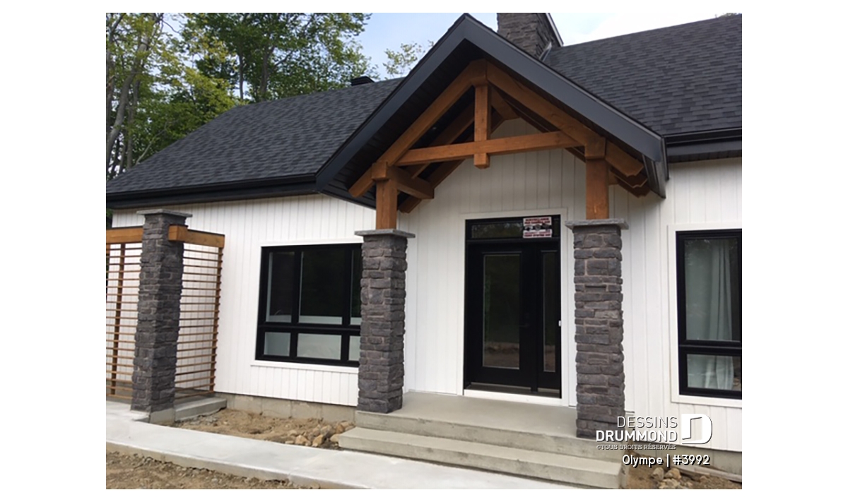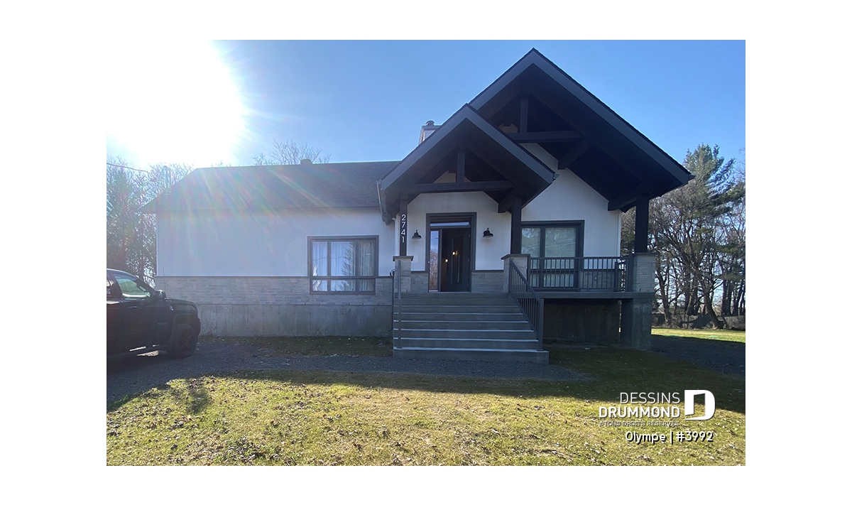 Le modèle OLYMPE (plan #3992) de Dessins Drummond séduit au premier regard par son allure élégant et intemporel. Que vous l’imaginiez en bord de lac ou au pied d’une montagne de ski, ce plain-pied évoque immédiatement le chalet douillet où il fait bon entrer, été comme hiver.
