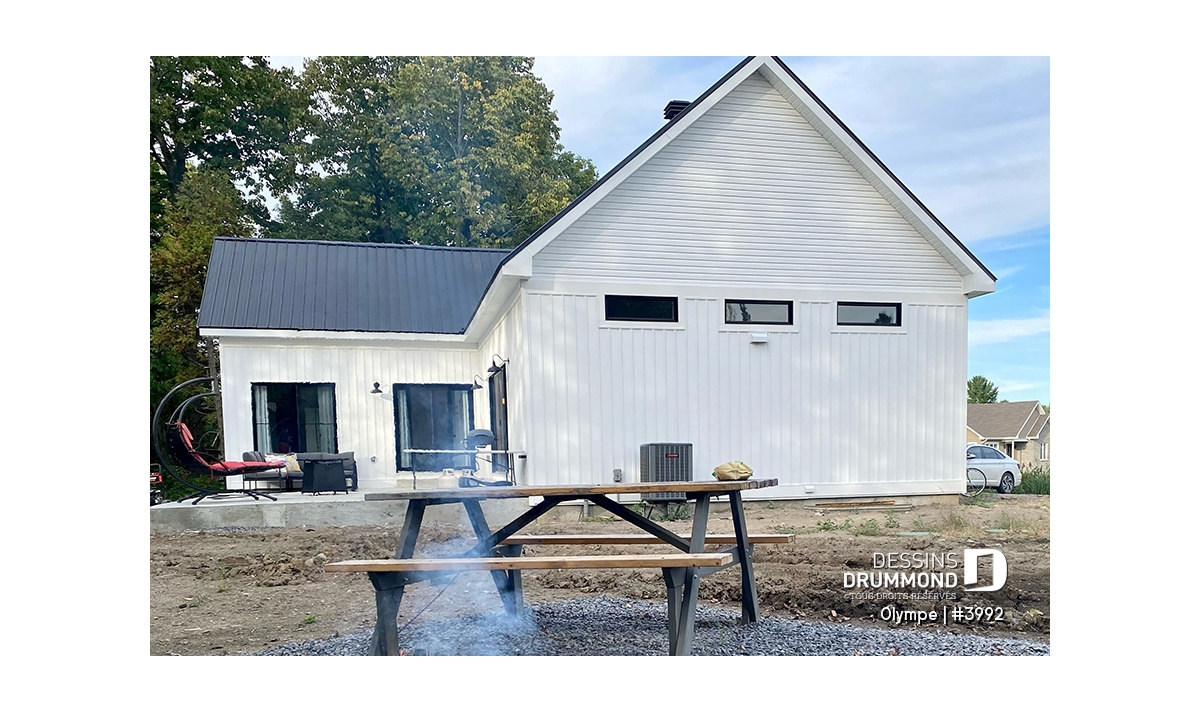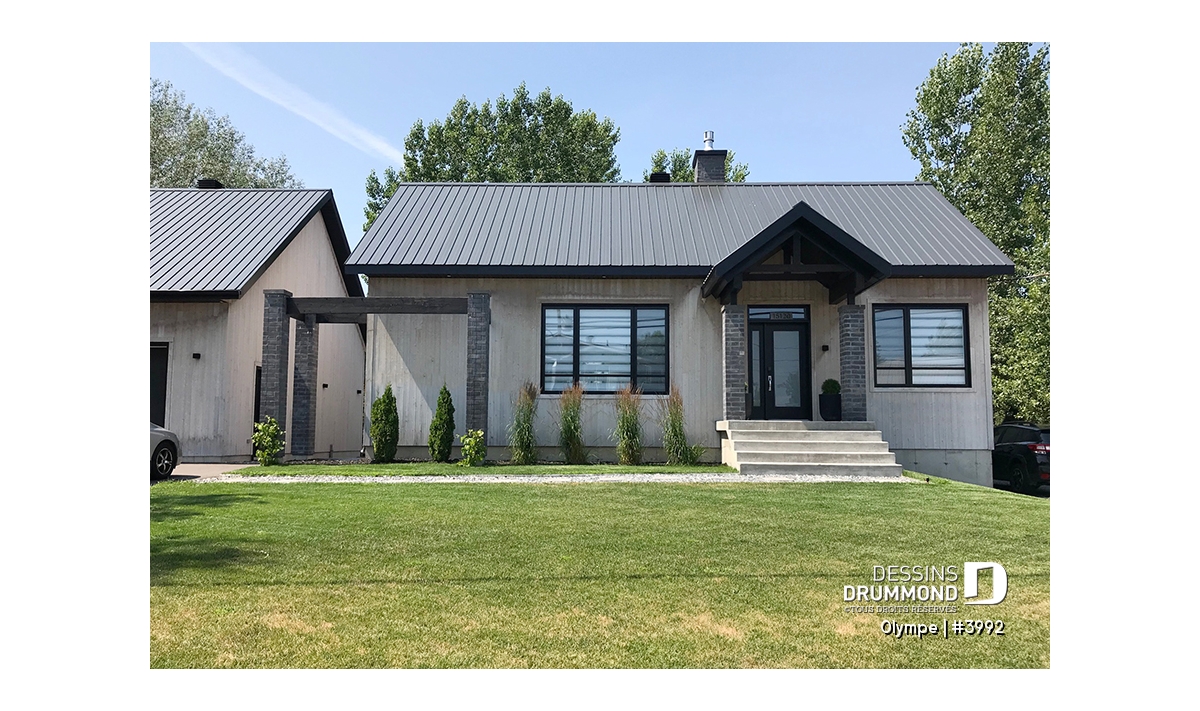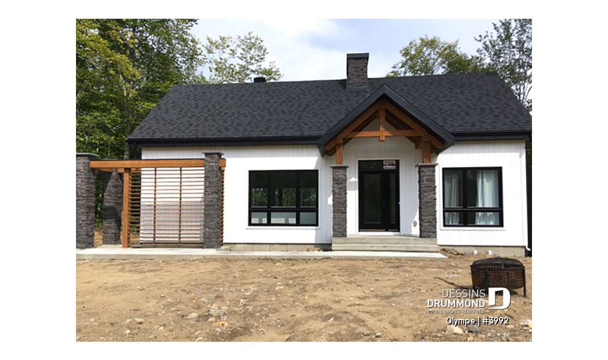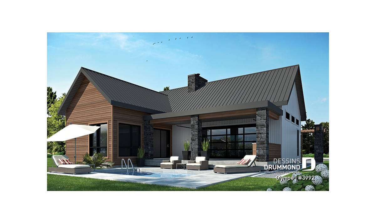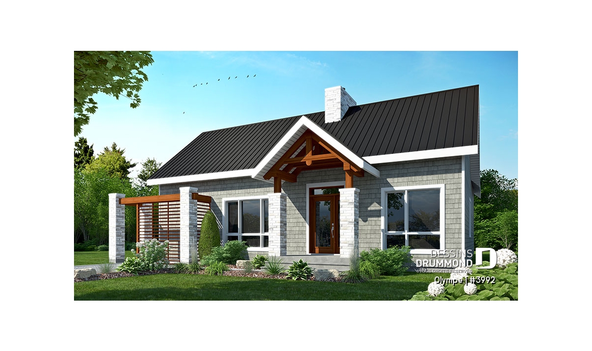 Le modèle OLYMPE (plan #3992) de Dessins Drummond séduit au premier regard par son allure élégant et intemporel. Que vous l’imaginiez en bord de lac ou au pied d’une montagne de ski, ce plain-pied évoque immédiatement le chalet douillet où il fait bon entrer, été comme hiver.