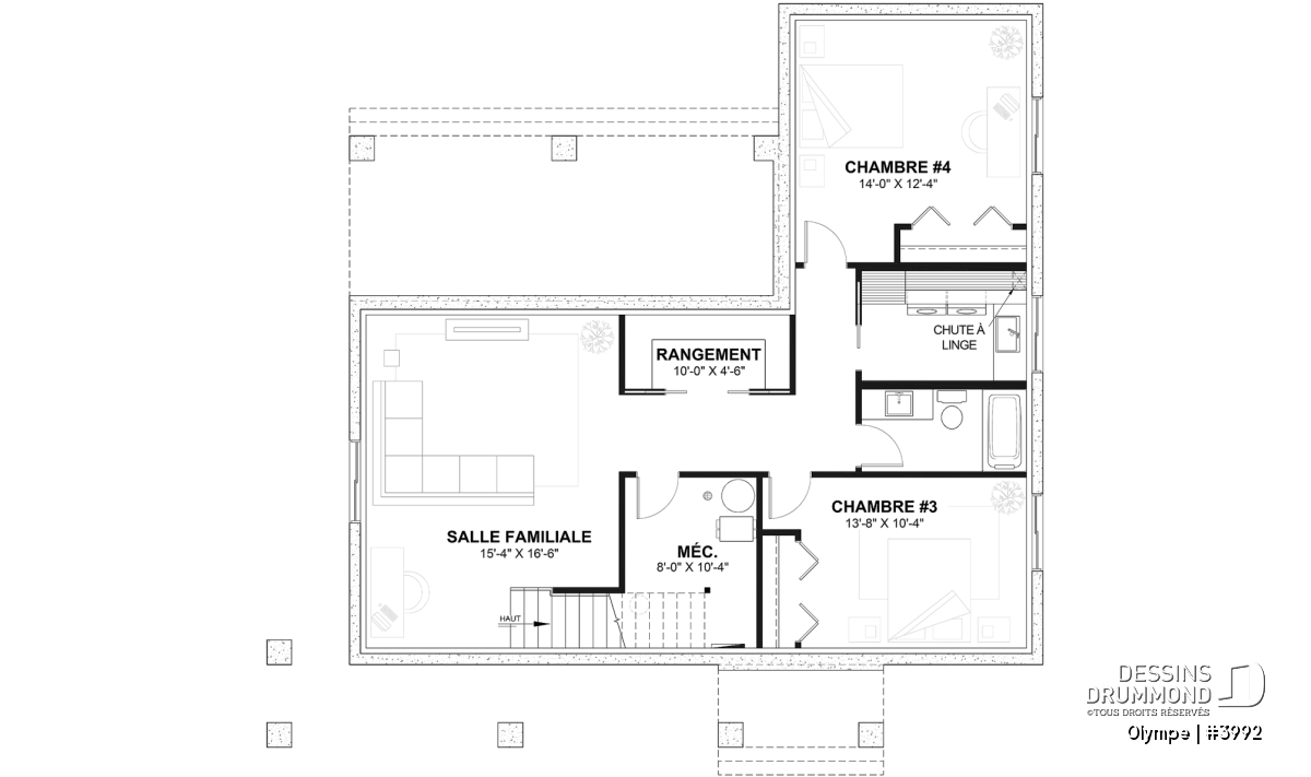 Plan # 3992-V1 : plancher exactement comme le modèles de base (# 3992), mais avec garage, 2 chambres, buanderie au sous-sol.